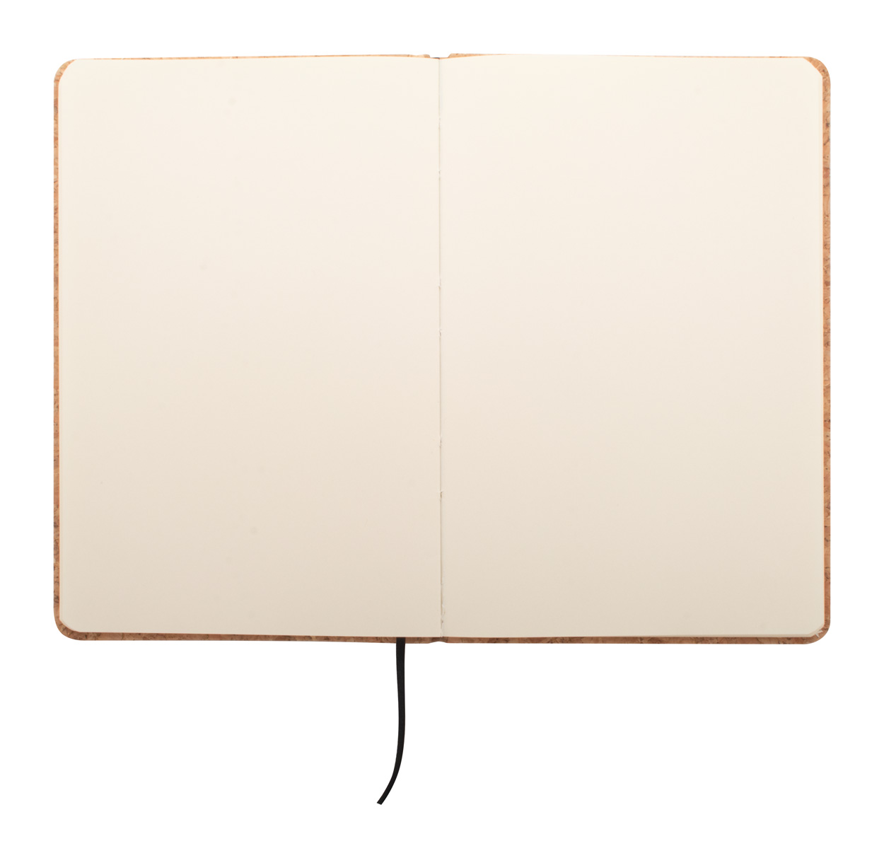 Blok A5 s deskami z přírodního korku s 80 čistými listy a gumičkou.