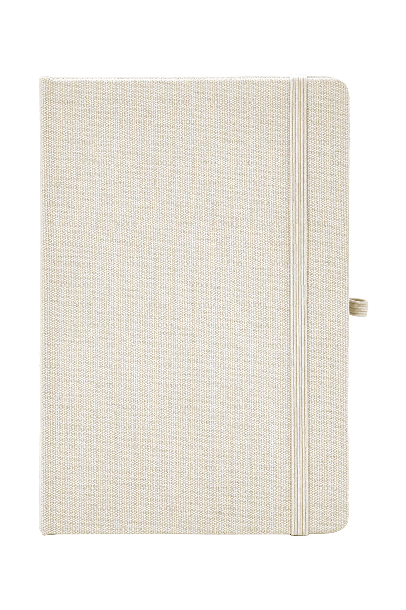 Blok potažený recyklovanou bavlnou s 80 linkovanými listy z recyklovaného papíru. Se záložkou v odpovídající barvě, gumičkou a držákem na pero. Velikost A5.