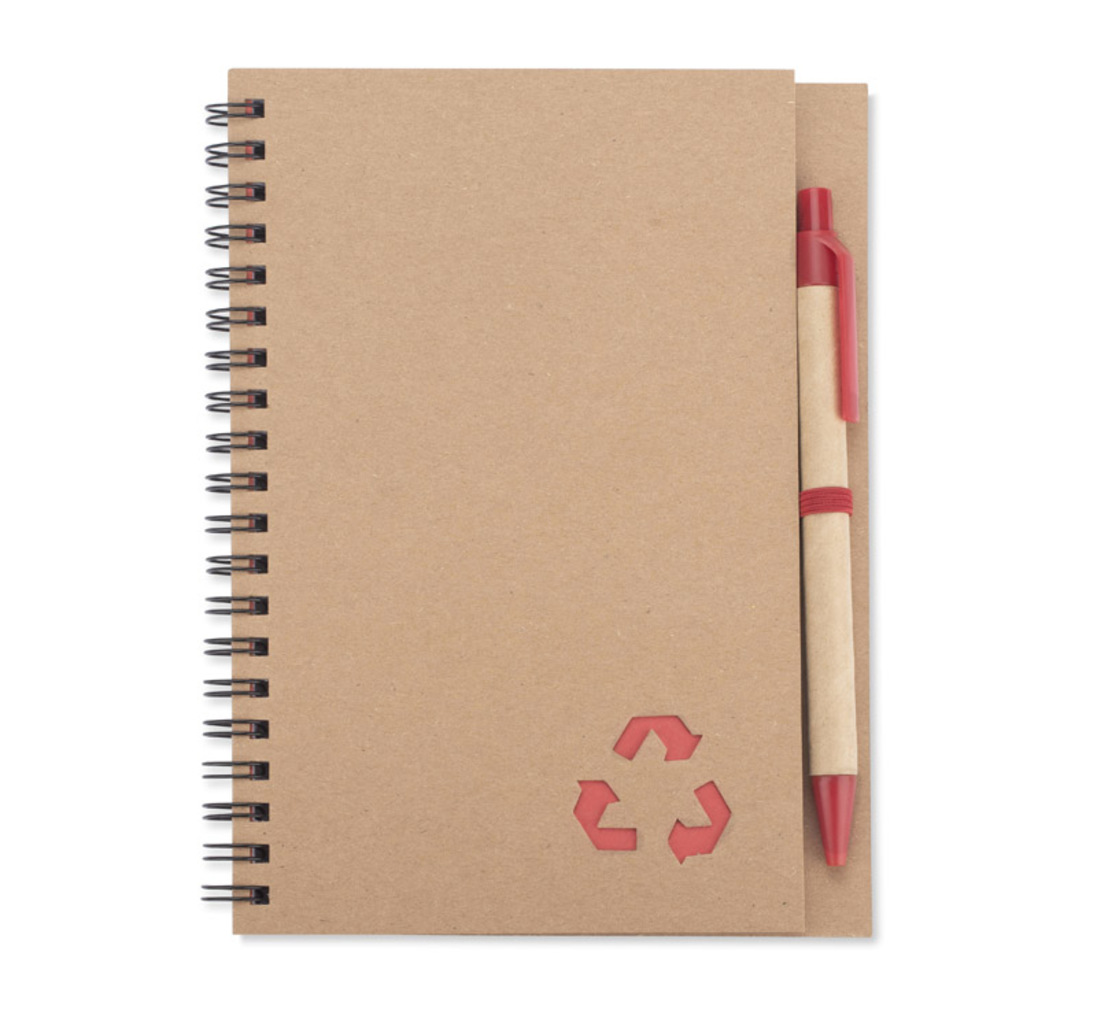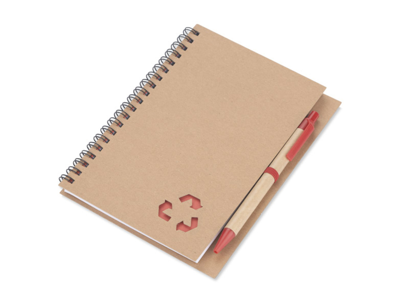 Spirálový zápisník SERENO s klasickým papírovým přebalem. Má 70 linkovaných listů papíru. Zápisník je dodáván s perem na profilovaném místě, jehož tělo je vyrobeno z papíru. Povrchová úprava pera odpovídá barvě přepážky notebooku. Modrá náplň do pera.