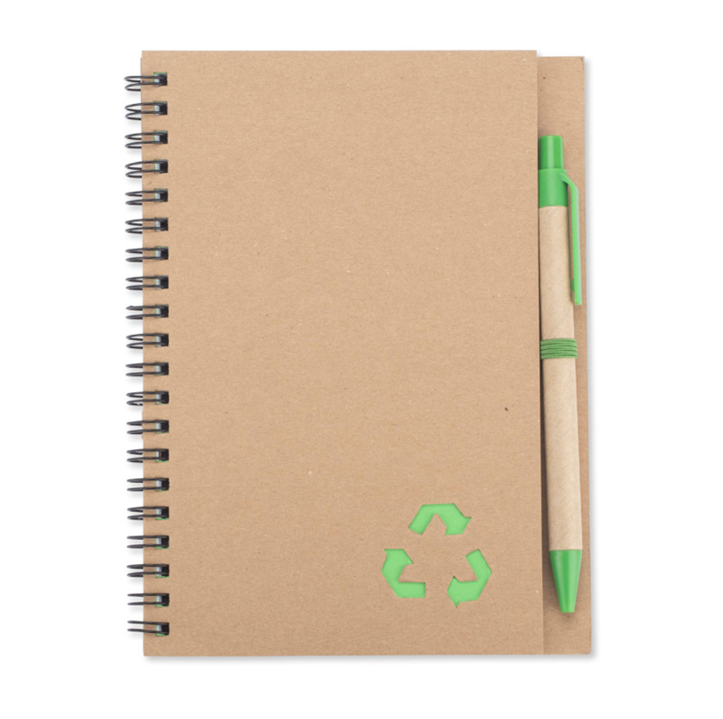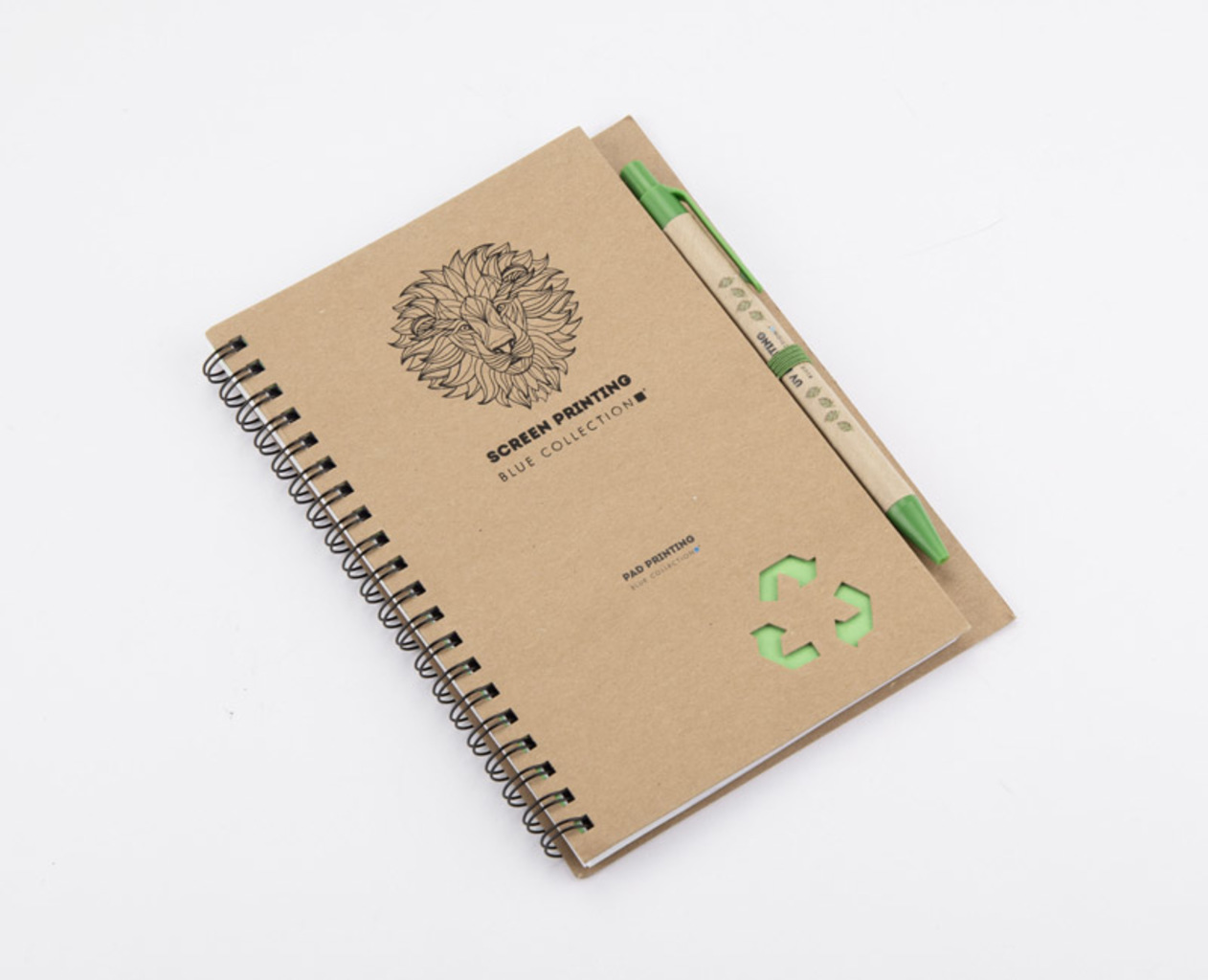Spirálový zápisník SERENO s klasickým papírovým přebalem. Má 70 linkovaných listů papíru. Zápisník je dodáván s perem na profilovaném místě, jehož tělo je vyrobeno z papíru. Povrchová úprava pera odpovídá barvě přepážky notebooku. Modrá náplň do pera.