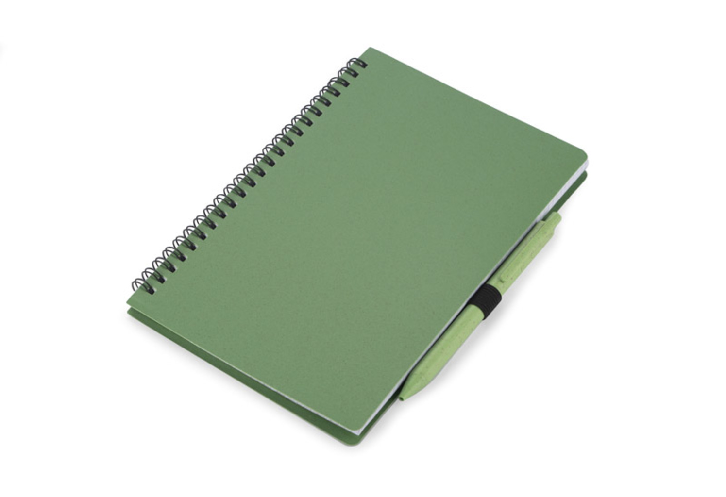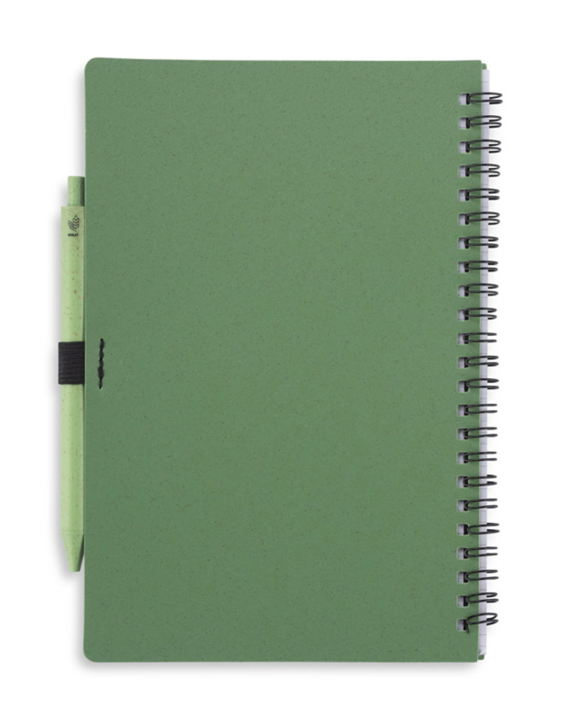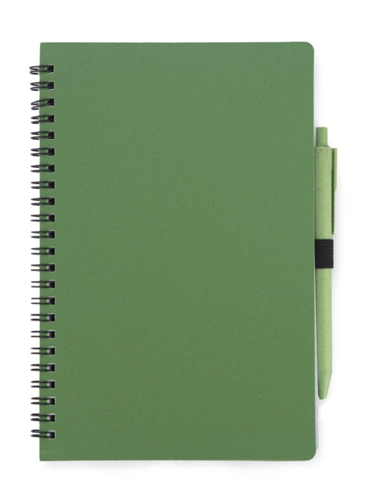 Zápisník TRESA s perem, barevně ladí s přebalem. Propiska a obal sešitu jsou vyrobeny z pšeničné slámy. Spirálový zápisník se 70 čtverečkovými listy z recyklovaného papíru. Formát A5. Modrá náplň do pera.