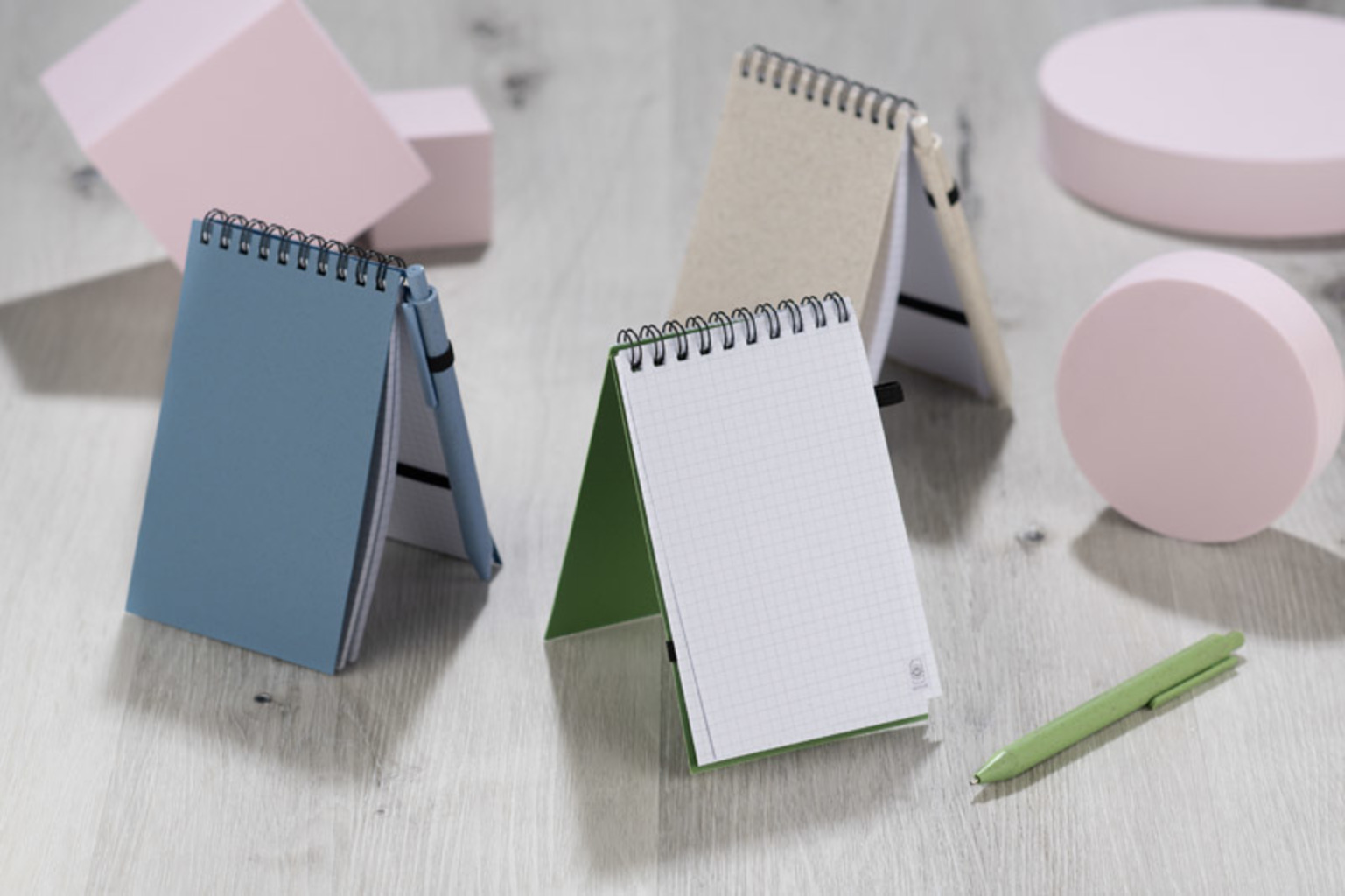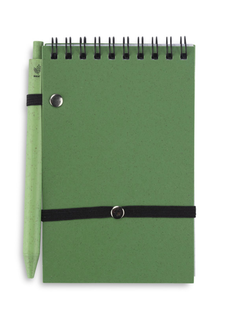 Zápisník TRESA s perem, barevně ladí s přebalem. Propiska a obal sešitu jsou vyrobeny z pšeničné slámy. Spirálový zápisník se 70 čtverečkovými listy z recyklovaného papíru. Uzavřeno elastickým páskem. Formát A6. Modrá náplň do pera.