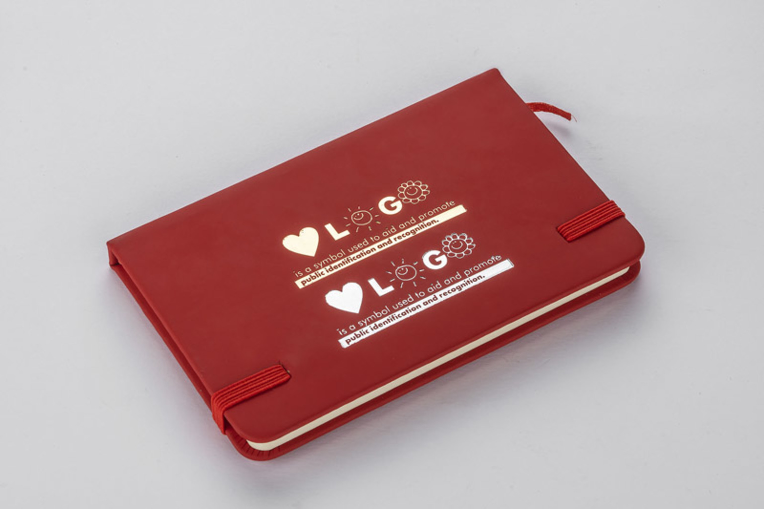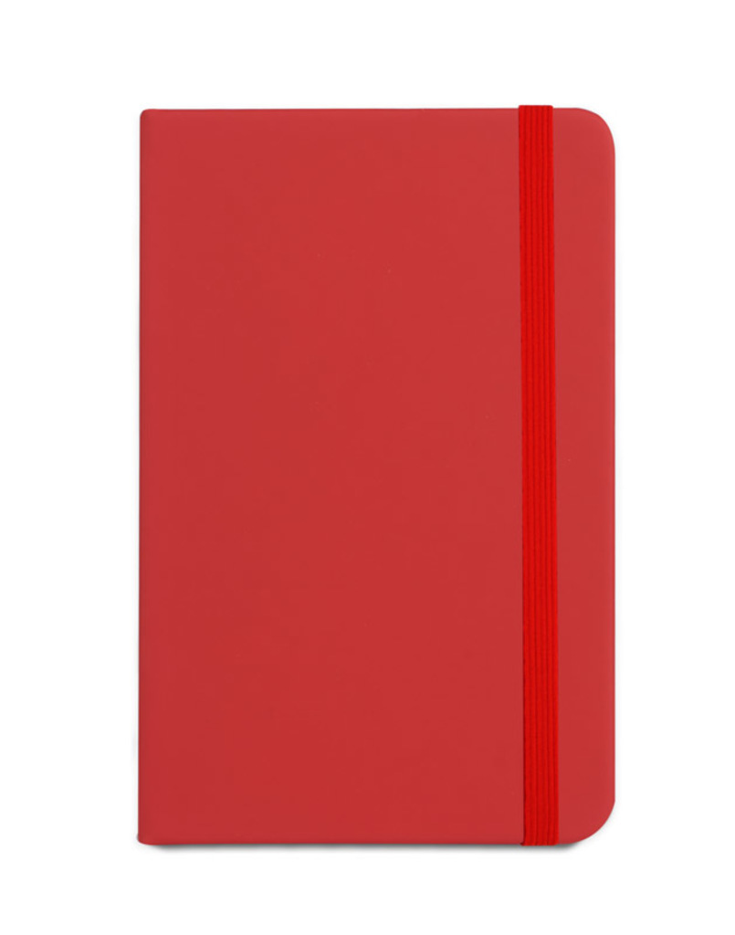 Vkusný zápisník A6 s barevnou gumičkou z materiálu podobného kůži (PU). Zápisník obsahuje 80 listů v barvě ecru s oranžovými linkami. Na obálku vám vytiskneme vaše logo.