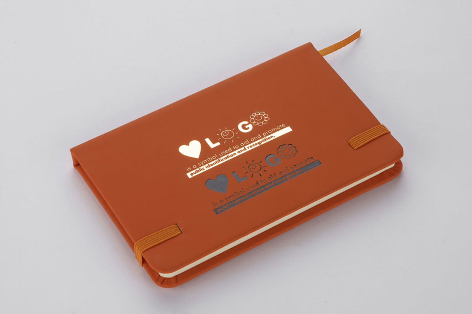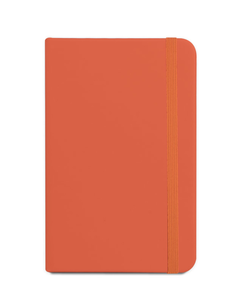 Vkusný zápisník A6 s barevnou gumičkou z materiálu podobného kůži (PU). Zápisník obsahuje 80 listů v barvě ecru s oranžovými linkami. Na obálku vám vytiskneme vaše logo.