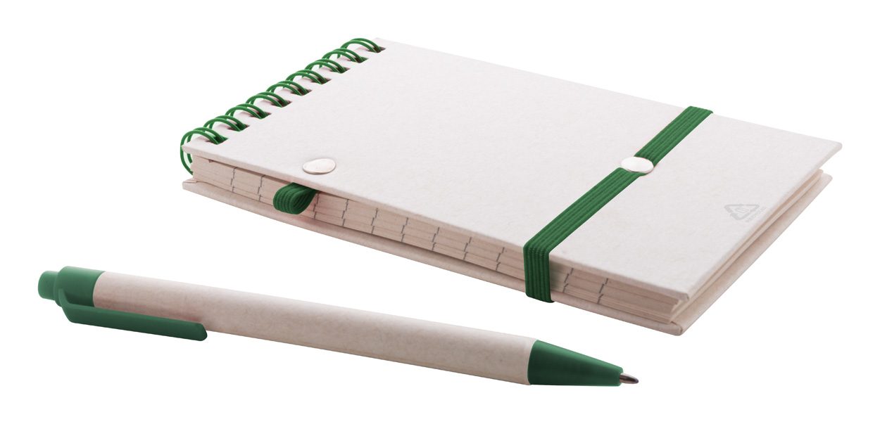 Spirálový blok A6 s deskami z recyklovaného z kartonu na mléko s pevnou vazbou a 70 linkovanými listy. Se spirálovými kroužky ve stejné barvě, gumičkou a poutkem na pero. Včetně recyklovaného kartonového papíru na mléko a recyklovaného ABS plastového kuličkového pera s modrou náplní.
