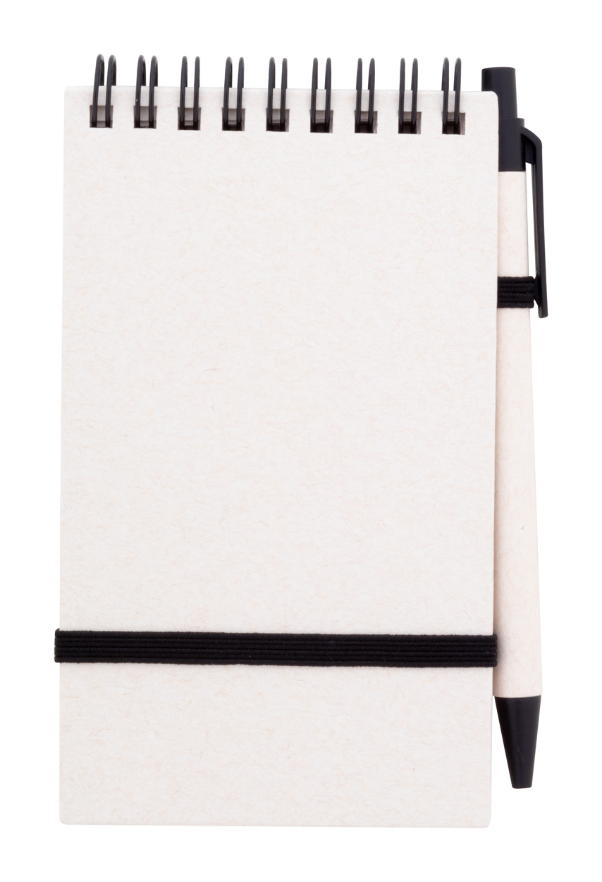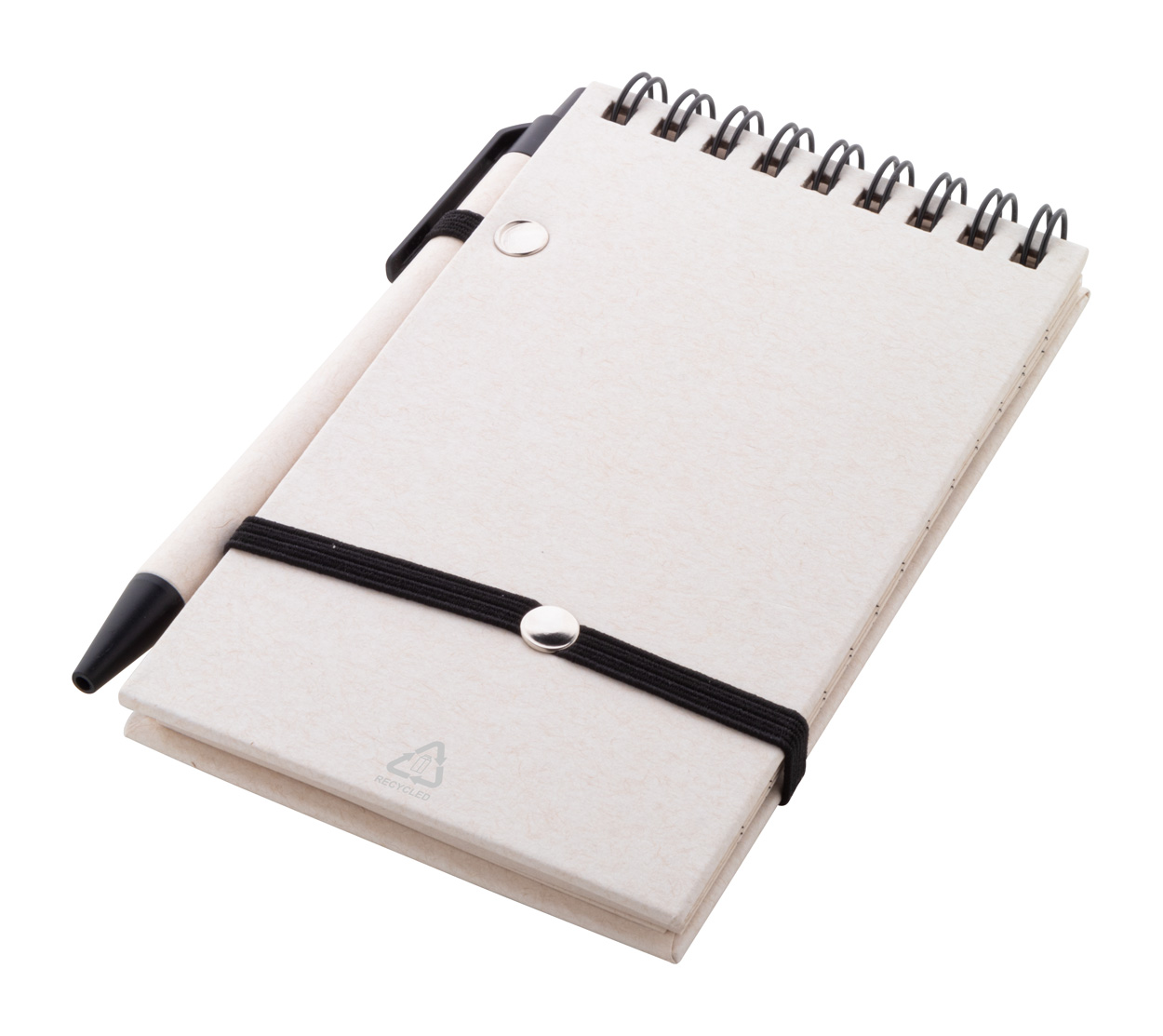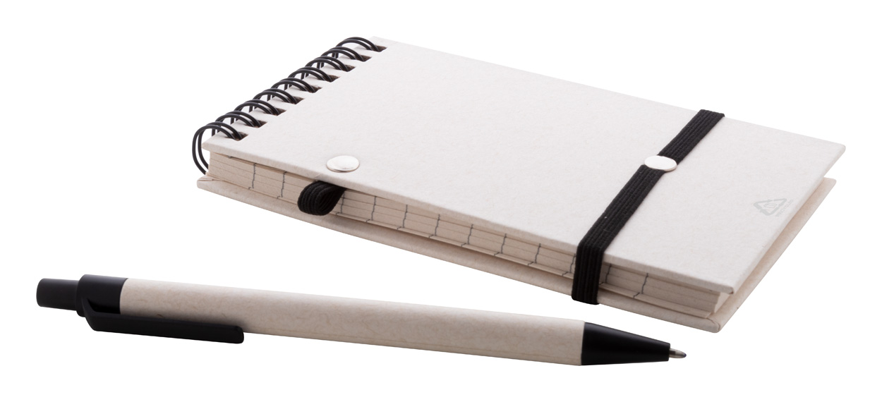 Spirálový blok A6 s deskami z recyklovaného z kartonu na mléko s pevnou vazbou a 70 linkovanými listy. Se spirálovými kroužky ve stejné barvě, gumičkou a poutkem na pero. Včetně recyklovaného kartonového papíru na mléko a recyklovaného ABS plastového kuličkového pera s modrou náplní.
