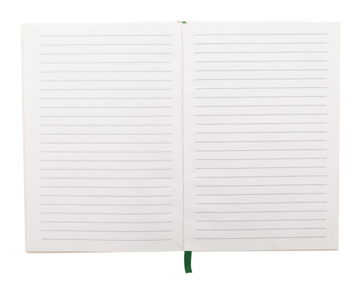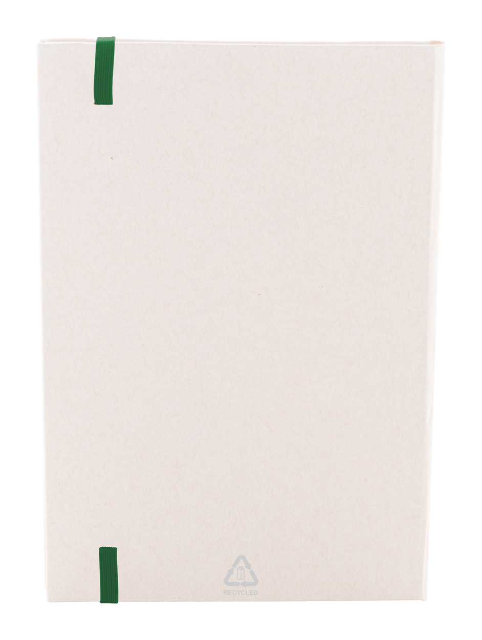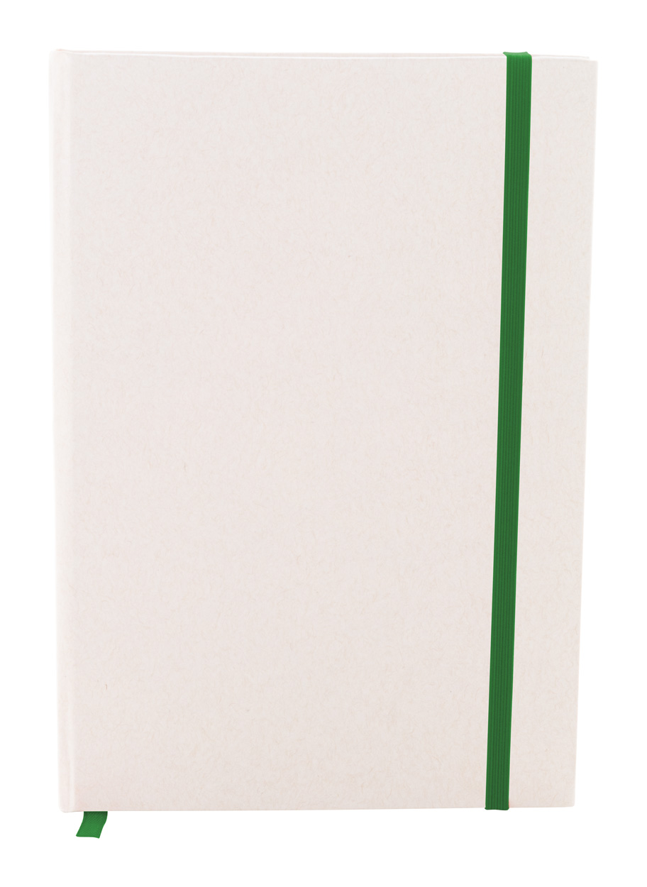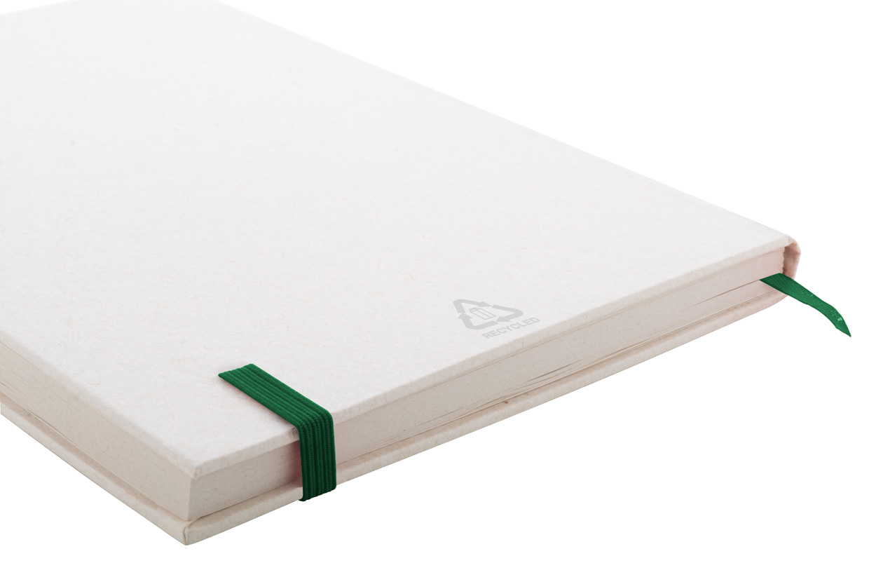 Papírový blok A5 z recyklovaného kartonu na mléko s pevnou vazbou a 80 linkovanými listy. S gumičkou v odpovídající barvě a poutkem na pero.