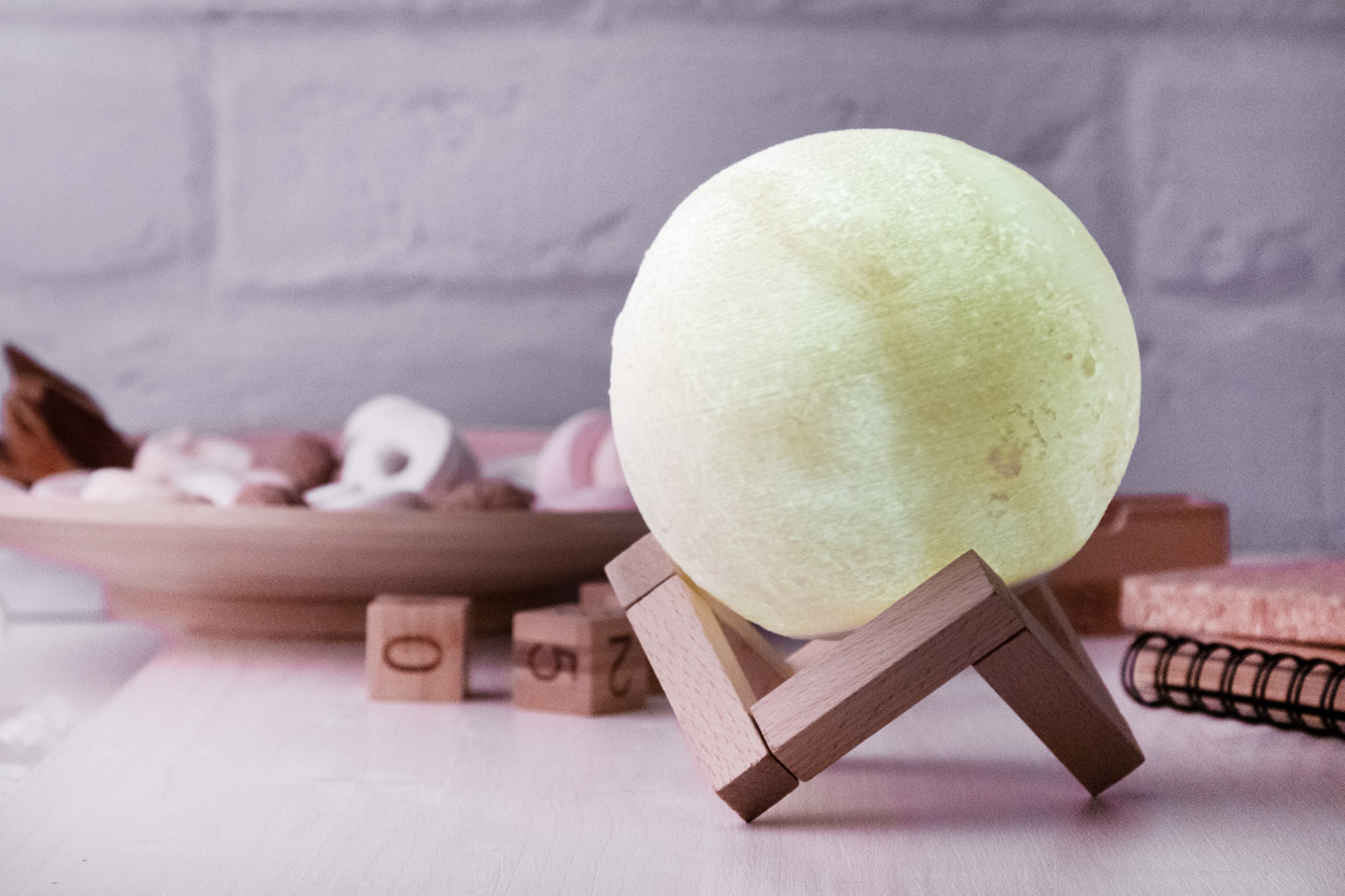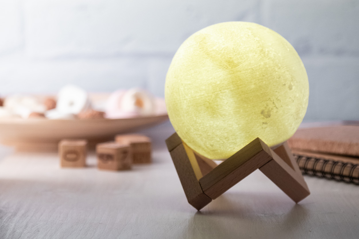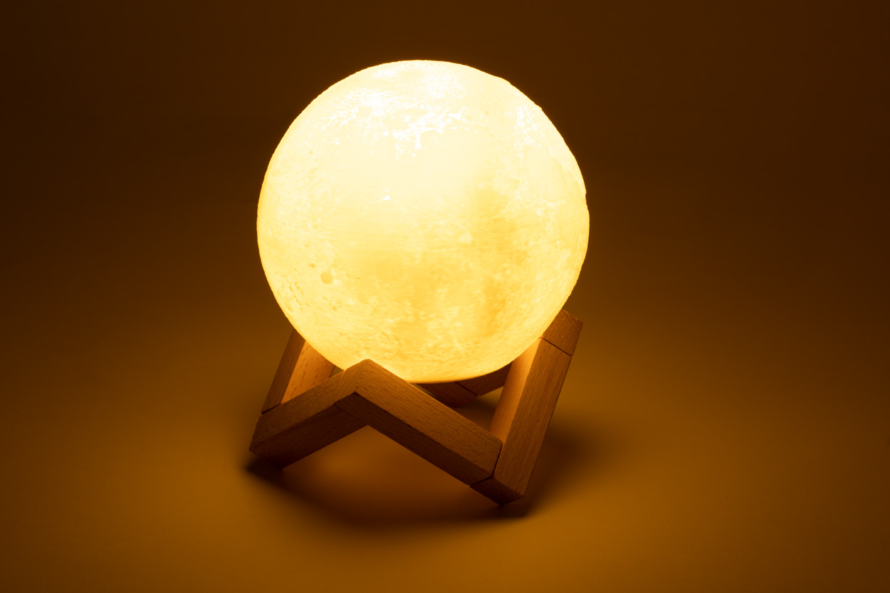 Bluetooth reproduktor ve tvaru Měsíce s vestavěnou dobíjecí baterií a dřevěným stojanem. LED světla s teplým a studeným světlem a nastavitelným jasem. Včetně nabíjecího kabelu USB.
