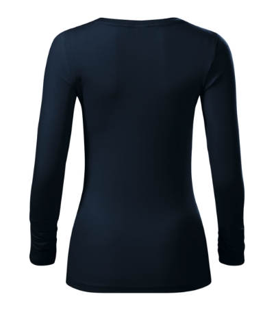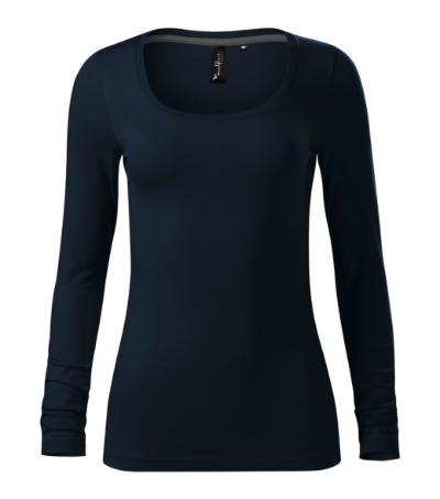 strečový materiál udržující stálost tvaru, přiléhavý střih s bočními švy, hlubší kulatý výstřih, úzký lem průkrčníku z žebrového úpletu 1:1 s 5 % elastanu, vnitřní část průkrčníku začištěna kontrastní páskou, zpevnění ramenních švů páskou, dlouhé rukávy