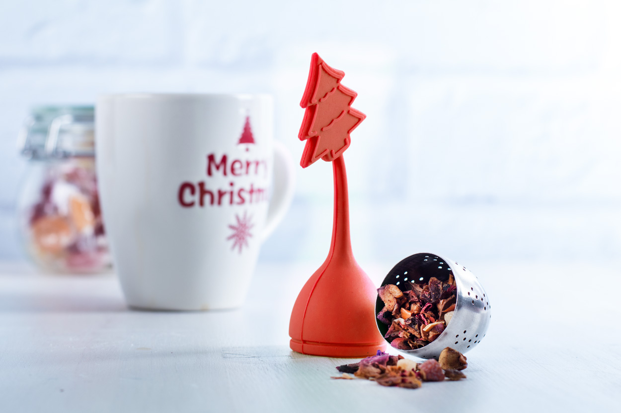 Čajítko s vánočním stromečkem, silikon/nerez ocel.