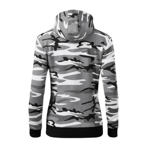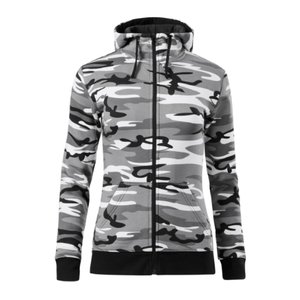 lehce vypasovaný střih s bočními švy, celopropínací reverzní spirálový zip, kapuce s podšívkou, na stažení šňůrkou, vnitřní část průkrčníku začištěna páskou, nakládané kapsy ve stylu klokanky, dolní lem a manžety rukávů z žebrového úpletu 2:2 s 5 % elastanu, kontrastní prvky, vnitřní strana počesaná