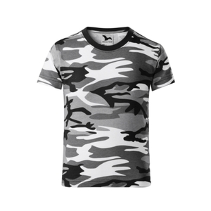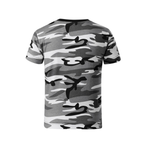 střih s bočními švy, úzký lem průkrčníku z žebrového úpletu 1:1 s 5 % elastanu, vnitřní část průkrčníku začištěna páskou v barvě camouflage, zpevnění ramenních švů páskou