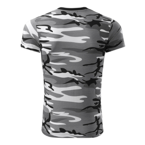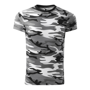 střih s bočními švy, úzký lem průkrčníku z žebrového úpletu 1:1 s 5 % elastanu, zpevňující páska od ramene k rameni v barvě camouflage
