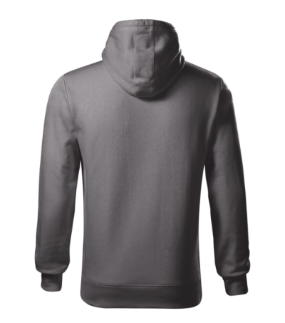 rovný střih s bočními švy, kapuce s podšívkou, na stažení šňůrkou, vnitřní část průkrčníku začištěna páskou v barvě vrchového materiálu, nakládaná kapsa ve stylu klokanky, dolní lem a manžety rukávů z žebrového úpletu 2:2 s 5 % elastanu, vnitřní strana počesaná