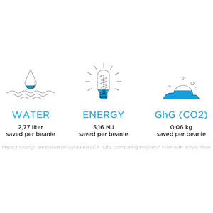 Čepice Hale je vyrobena z vlákna Polylana® - nízkoemisní alternativy ke 100% akrylovým a vlněným vláknům -, která šetří vodu, energii a snižuje emise CO2 při výrobě a barvení. V porovnání s akrylovým vláknem dochází u každé čepice Hale k následující úspoře dopadu: 2,77 litru vody, 5,16 MJ energie a 0,06 kg GhG (CO2). Úspory dopadů vycházejí z ověřených údajů z hodnocení životního cyklu (LCA). Vyrobeno z žebrového úpletu 1x1 s vlákny Polylana® a akrylem o hustotě 12. Ideální volba pro ty, kteří si cení módy a zároveň dbají na životní prostředí.