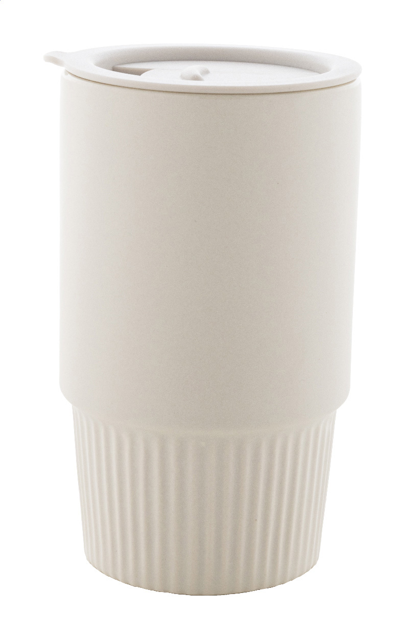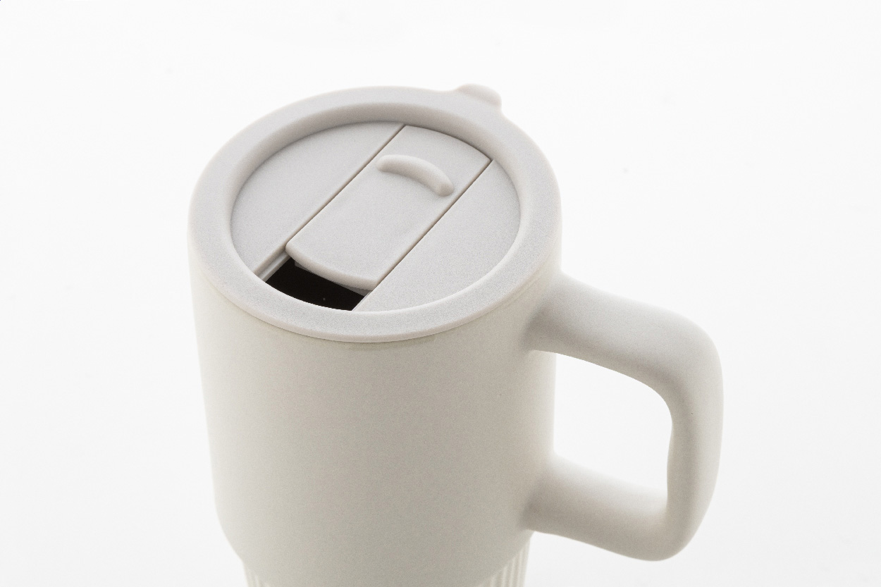 Vysoce kvalitní keramický cestovní hrnek s matným vnějším povrchem a plastovým víčkem z polypropylenu. 420 ml.