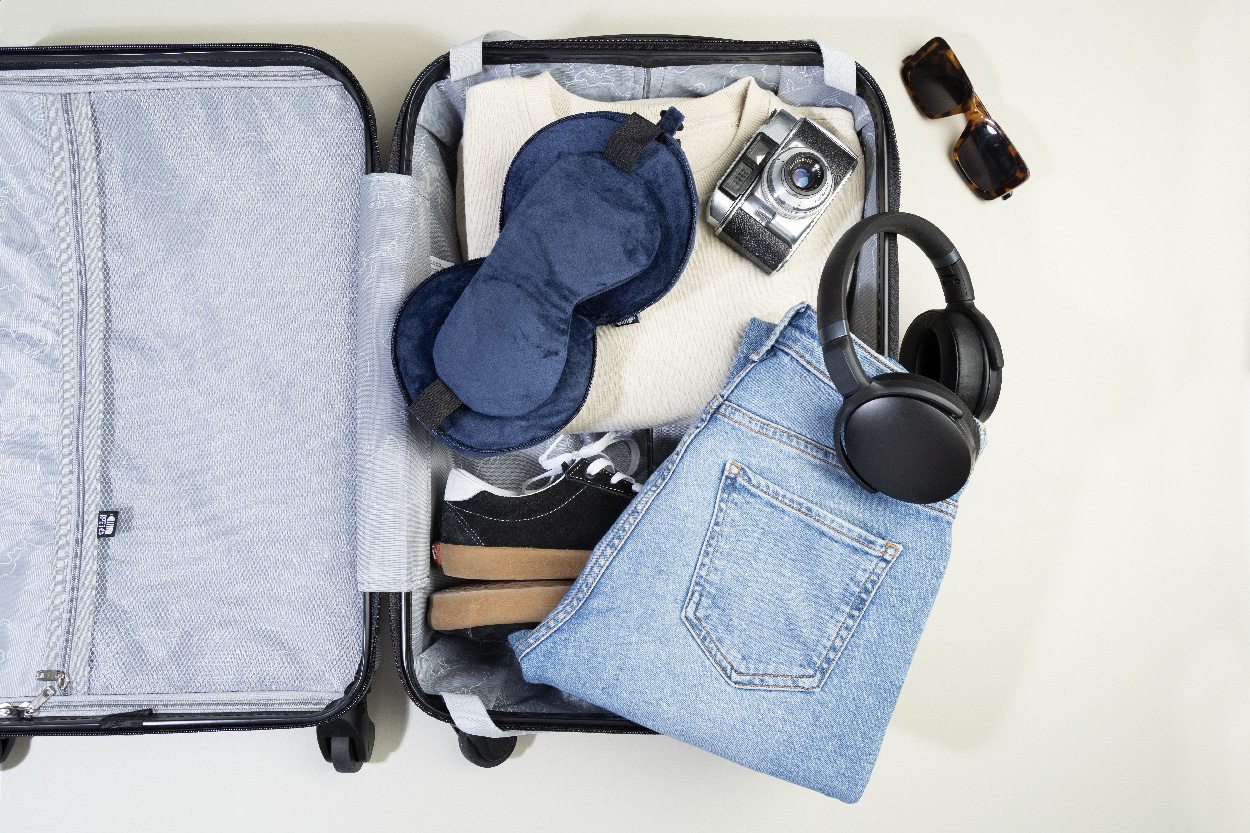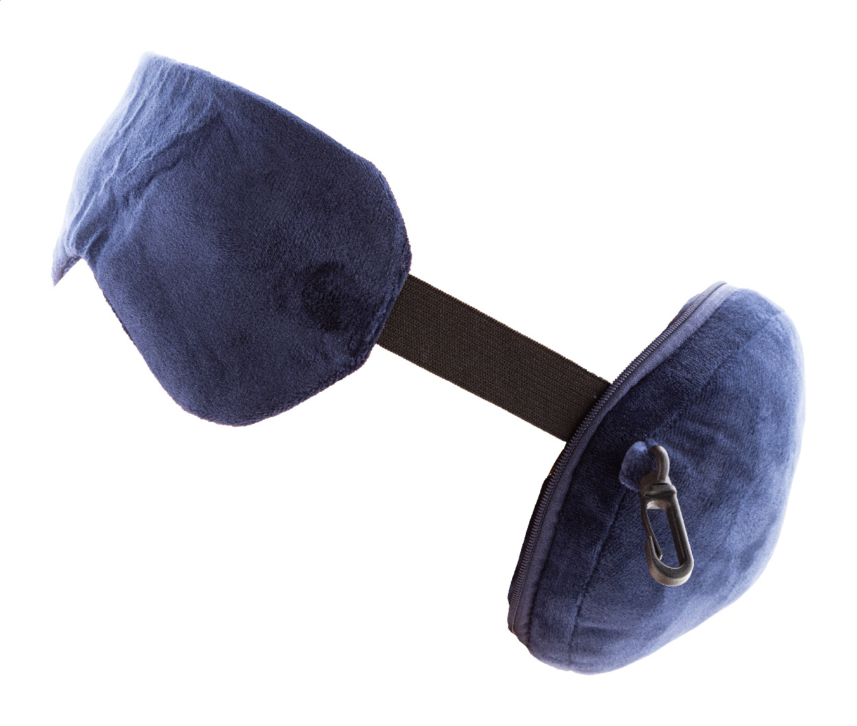 Cestovní polštář z RPET polyesteru s integrovanou oční maskou a elastickými popruhy. Zapíná se do kompaktního kulovitého tvaru pro snadné skladování a obsahuje karabinu z PP pro připevnění k zavazadlu. S výraznou etiketou z RPET.