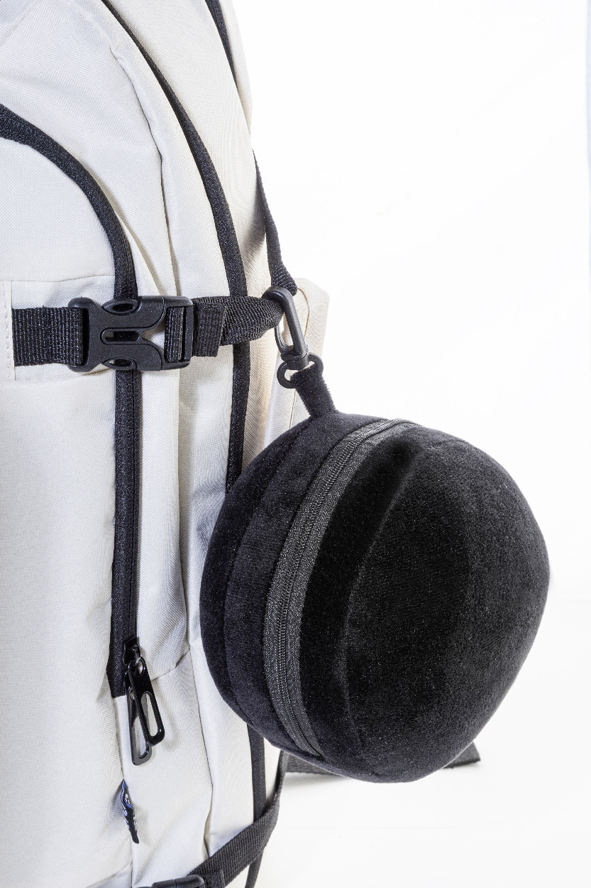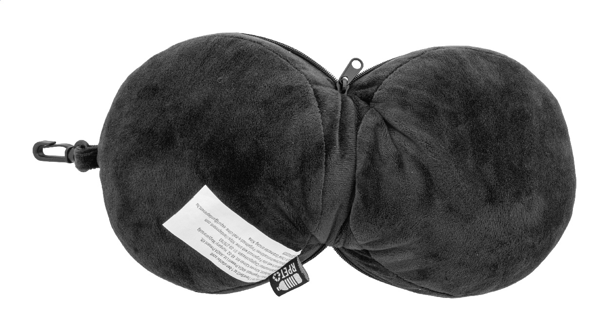 Cestovní polštář z RPET polyesteru s integrovanou oční maskou a elastickými popruhy. Zapíná se do kompaktního kulovitého tvaru pro snadné skladování a obsahuje karabinu z PP pro připevnění k zavazadlu. S výraznou etiketou z RPET.