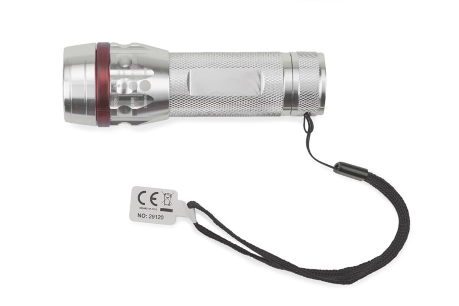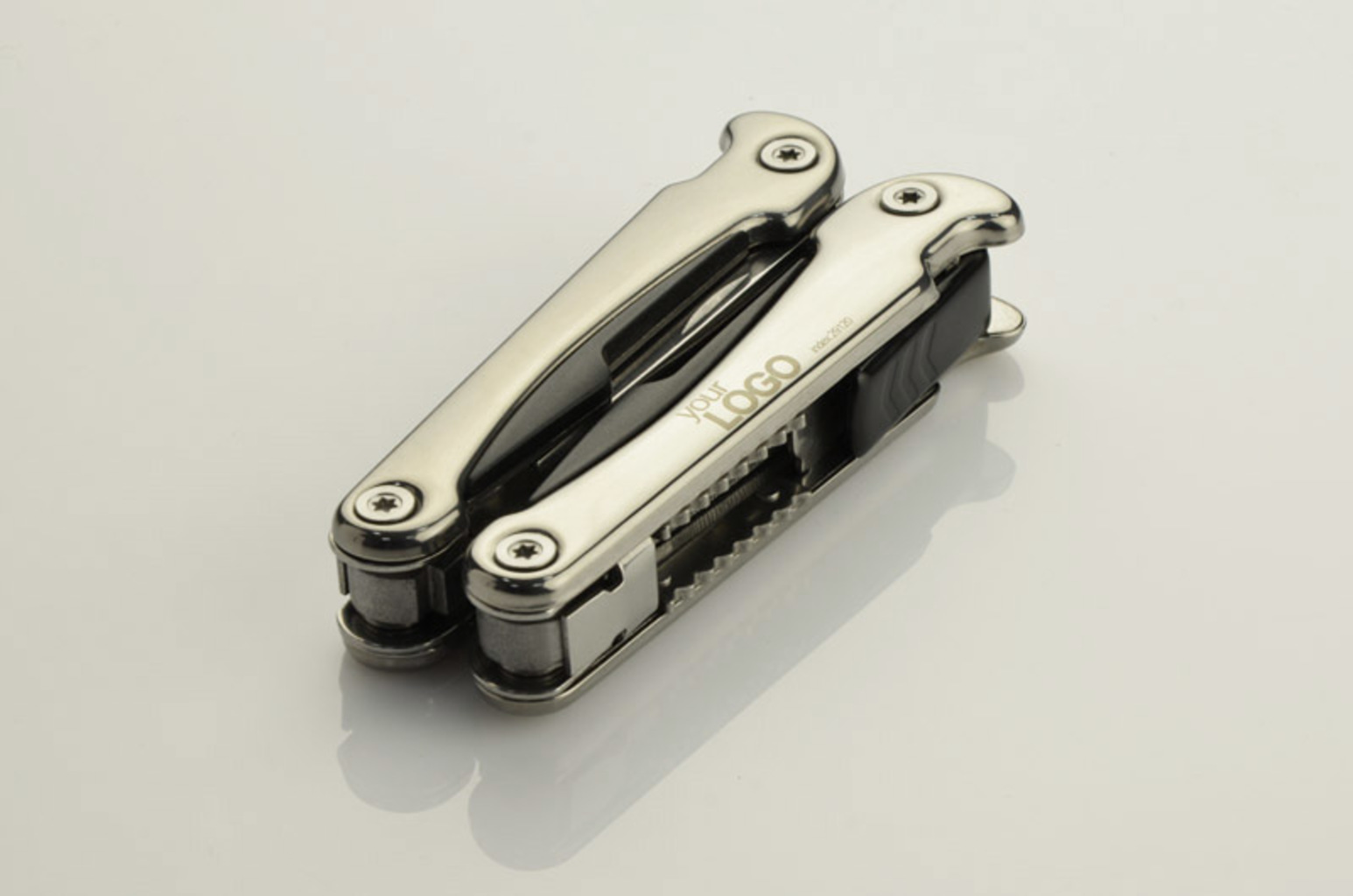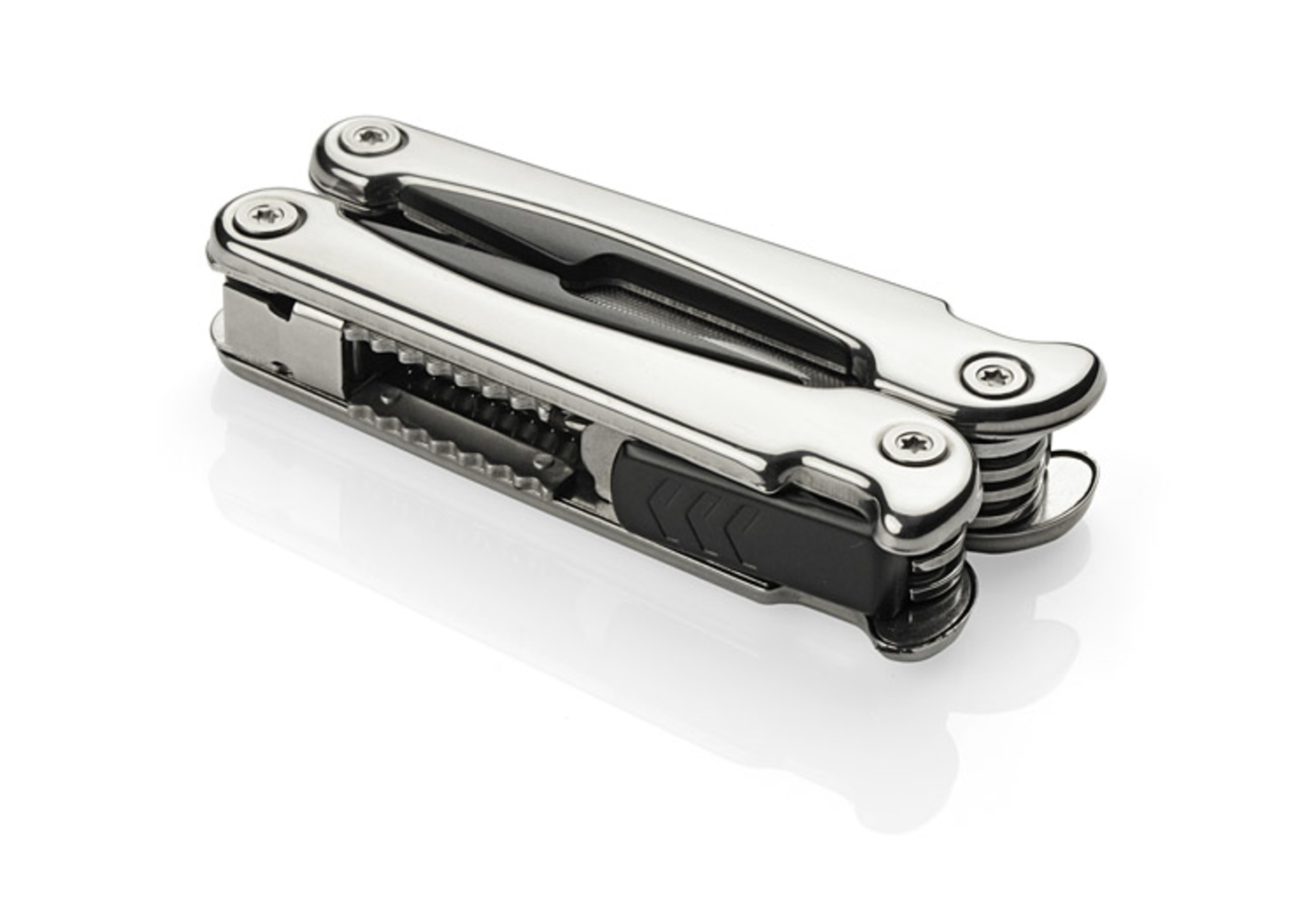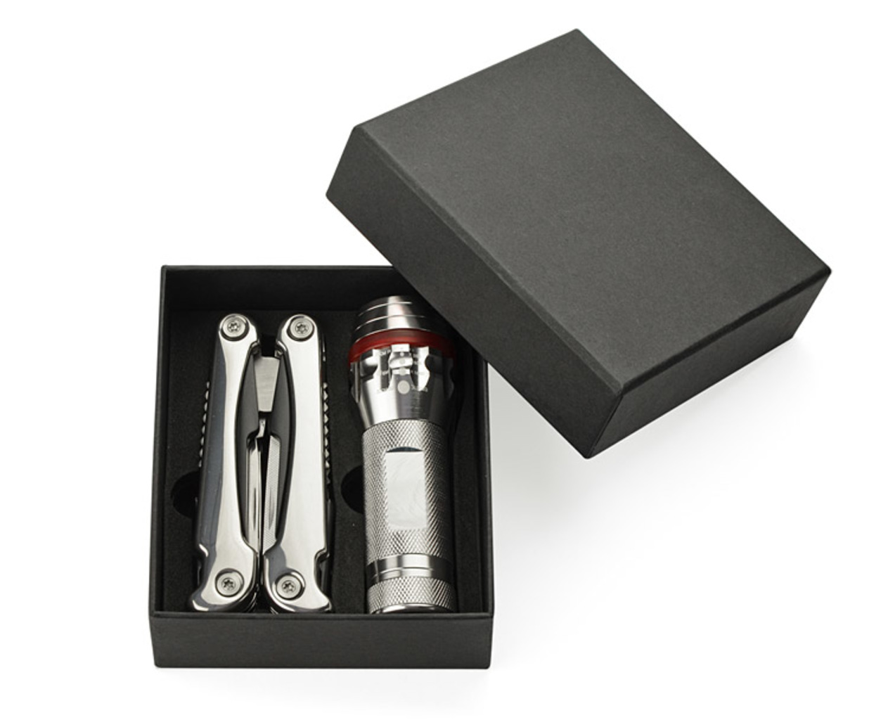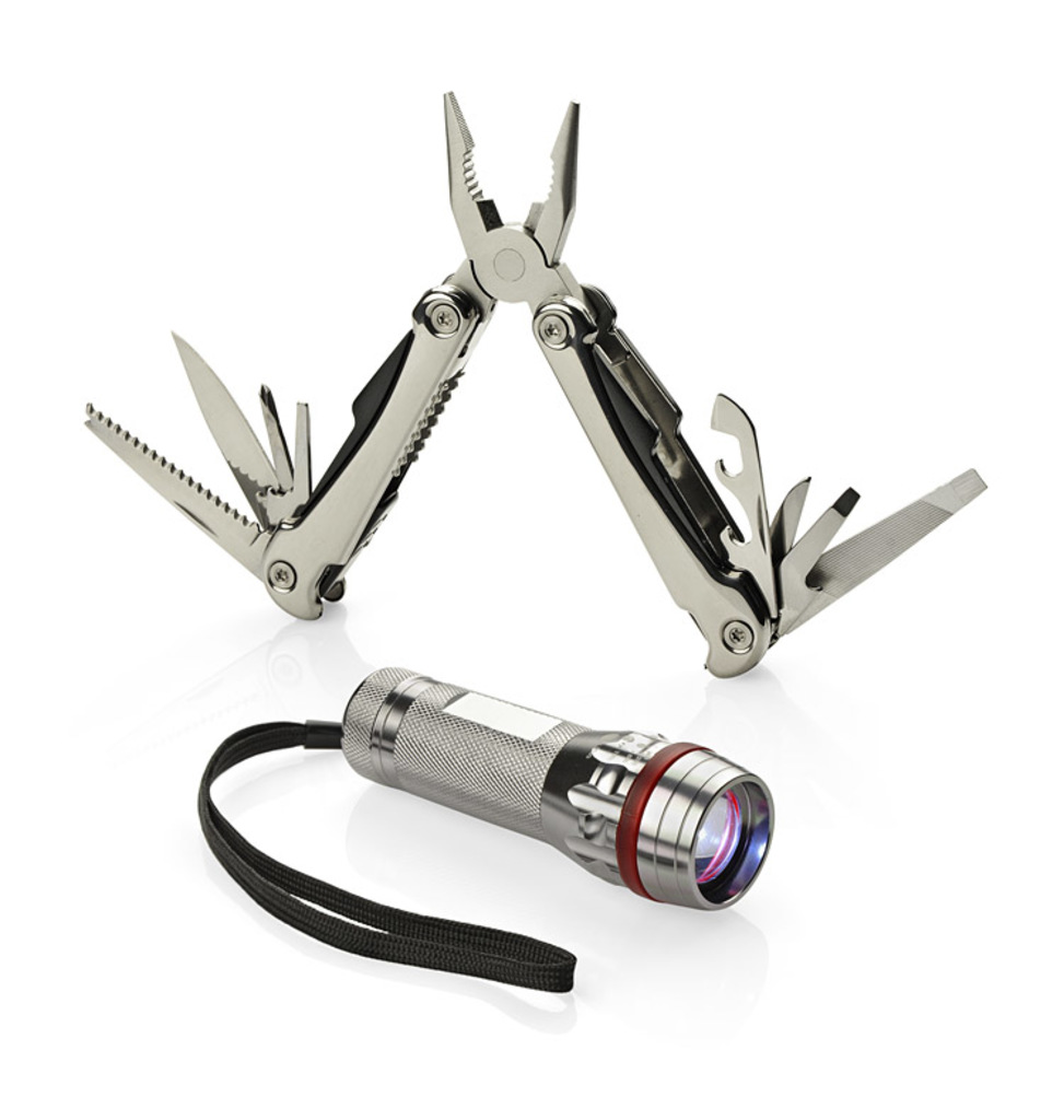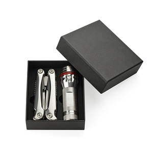 Dárková sada obsahující svítilnu a multifunkční nářadí: kleště, pilník, otvírák na konzervy, otvírák na láhve, štípač papíru, mini šroubovák (nástrčný), plochý a křížový, zubatý pilník. Svítilna má velmi jasnou LED diodu, nastavitelný paprsek a 3 režimy svícení: silný, slabý a blikající. Každá součást je vyrobena z kovu a celek je zabalen v elegantní černé krabičce.