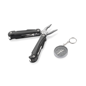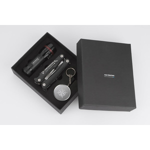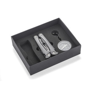 Sada darů zahrnující baterku, multifunkční nástroj a kompas. Baterka má velmi silnou diodu, nastavitelný světelný paprsek (funkce zoomu) a 3 režimy světla: silný, slabý a blikající. Každý prvek je vyroben z kovu a sada je balena v elegantní černé krabičce.