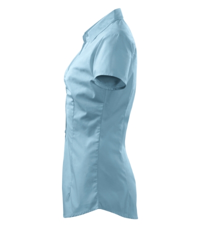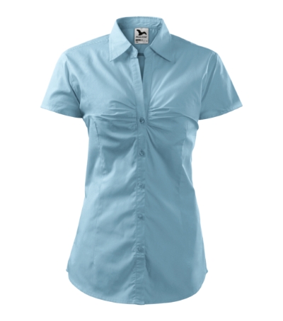 jednoduché sedlo a záševky na zadním dílu, pasové záševky, oblast hrudníku zdobena řasením, dvoudílný košilový límec s rozhalenkou, přední kraje začištěny légou, knoflíčky v barvě materiálu (1 náhradní navíc), tvarovaný dolní kraj