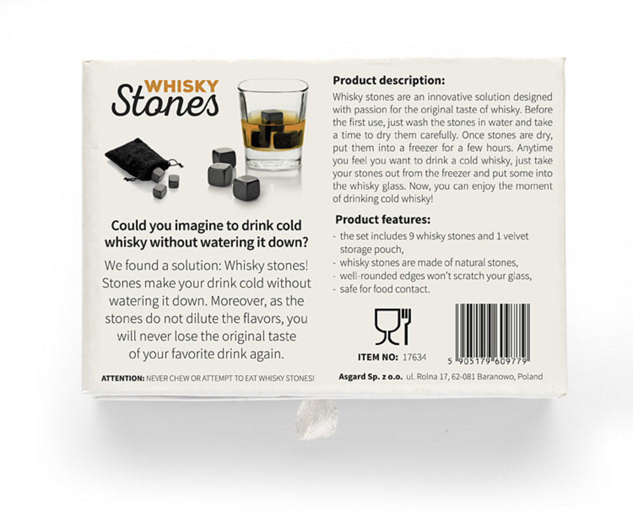 Kameny na whisky - úplná novinka na našem trhu - gadget pro náročné zákazníky, zejména pro milovníky whisky. Tento set 9 speciálních kamenů úplně nahrazuje tradiční ledové kostky. Vše, co musíte udělat, je nechat kameny na whisky ve vašem mrazáku po dobu asi 4 hodin. Po této době je můžete použít jako náhradu za ledové kostky. Největší výhody tohoto gadgetu oproti tradičním ledovým k