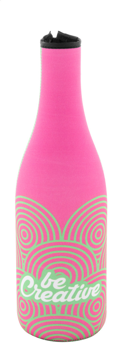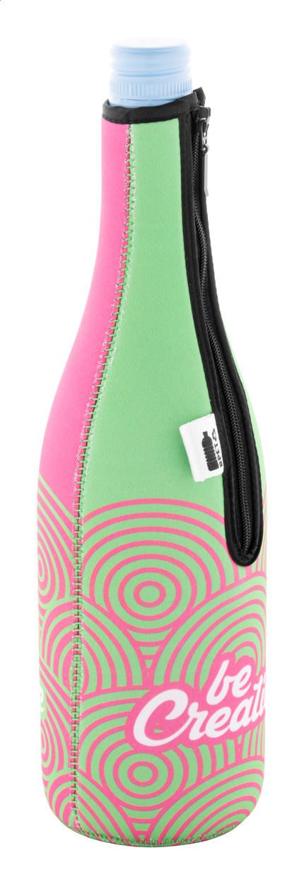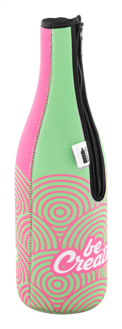 Na zakázku vyrobený neoprenový obal na láhev vína nebo šampaňského z materiálu RPET se zipem. S celoplošným sublimačním potiskem. MOQ: 25 ks.