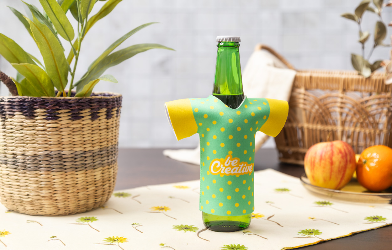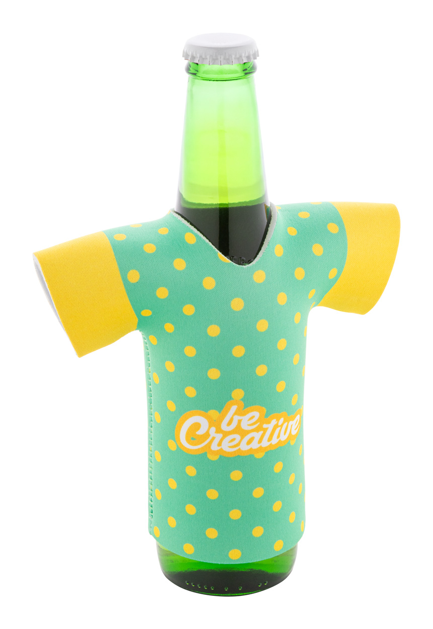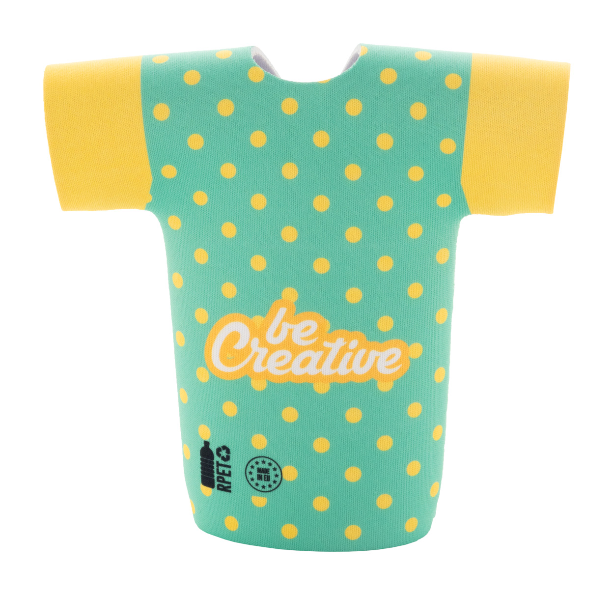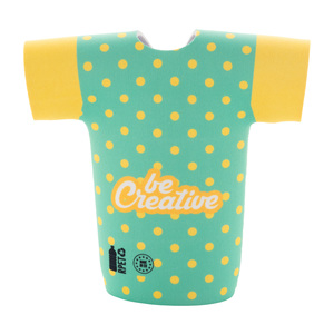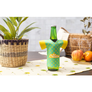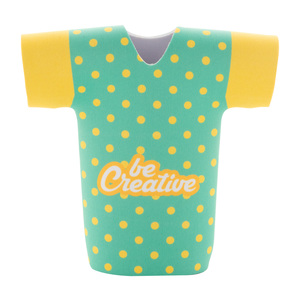 Na zakázku vyrobený RPET neoprenový chladící obal na pivní láhev ve tvaru trička. S celoplošnou sublimační tištěnou grafikou, cena nezahrnuje tiskovou přípravu. Min. mn.: 50 ks.