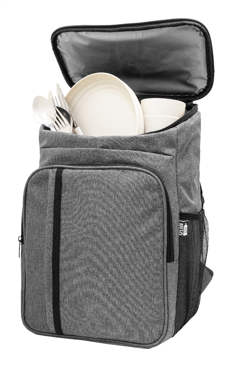 Chladicí piknikový batoh z RPET s přední kapsou na zip a chladicí přihrádkou na zip s PEVA výplní. S bočními síťovanými kapsami, polstrovanými zády a ramenními popruhy. Včetně nádobí z PP a nerezové oceli pro 2 osoby: 2 talíře, 2 hrnky, 2 vidličky, 2 lžíce a 2 nože. 600D RPET polyester s výrazným štítkem RPET.