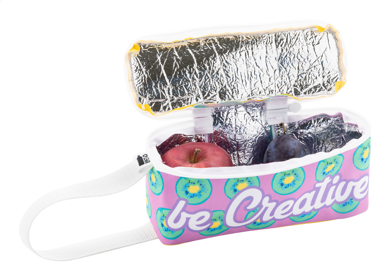 Na zakázku vyrobená mini chladící taška na oběd na zip z 600D RPET polyesteru s hliníkovou výplní. Ideální pro zabalení svačiny nebo sendviče. S celoplošně tištěnou sublimační grafikou a výrazným štítkem RPET. Cena nezahrnuje tiskovou přípravu. Min. mn.: 25 ks.