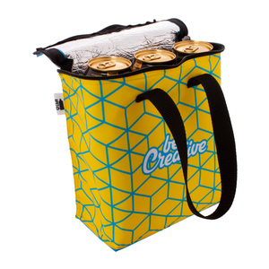 Na zakázku vyrobená chladicí taška na zip z 600D RPET polyesteru s hliníkovou výplní pro 6 ks 0,33 l plechovek. S celoplošně tištěnou sublimační grafikou a výrazným štítkem RPET, cena nezahrnuje tiskovou přípravu. Min. mn.: 50 ks.
