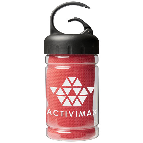 Rychlá absorpce, rychlé schnutí, pratelný chladivý ručník pro ochlazení během cvičení nebo venkovním sportu. Dodává se v nádobce z PET s rukojetí s vestavěnou karabinou pro snadné nošení. Dostupné v 5 svěžích barvách. Velká dekorační oblast loga na nádobce, dekorace je také možná na samotném chladivém ručníku. Velikost: 30 x 80 cm.