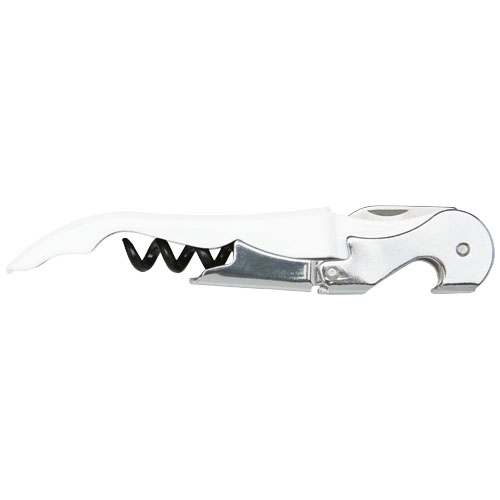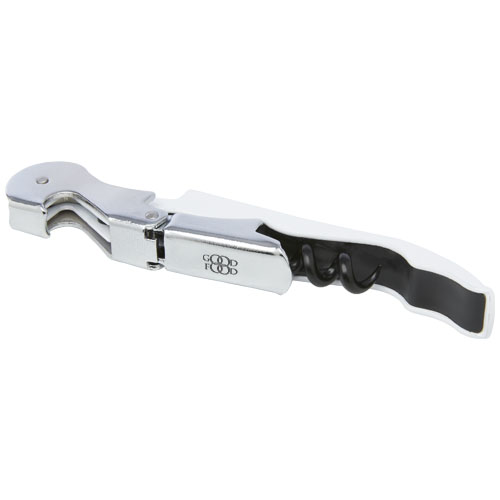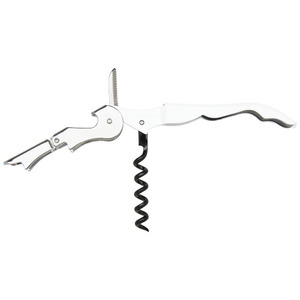 Nerezový číšnický otvírák s barevným tělem s vývrtkou, řezačkou fólie a otvírákem na lahve. Díky dvoustupňové konstrukci lze snadno vytáhnout zátku z lahve.