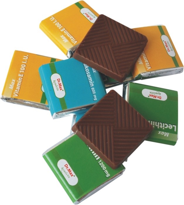 papír křída lesk 90 g/m², tisk 4 barvy, 31 × 31 × 5 mm, ostatní druhy čokolád za příplatek, min 1 500 ks
