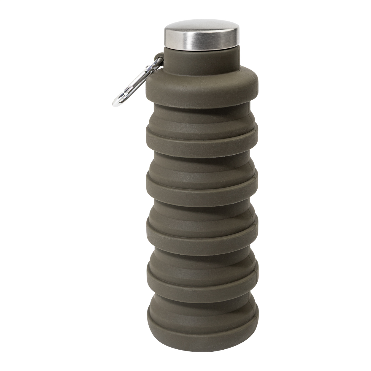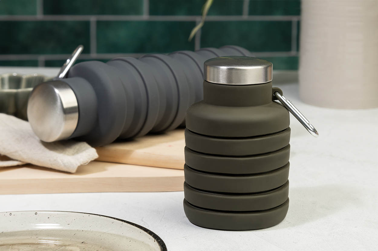 Skládací silikonová láhev s víčkem z nerezové oceli a hliníkovou karabinou. 500 ml