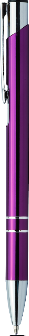 Kovová kuličková propiska v několika barvách s chromovými doplňky (špička, tlačítko, spona a dva designové proužky na těle propisky). Náplň pera je modrá.