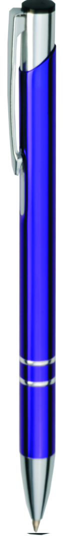Kovová kuličková propiska v několika barvách s chromovými doplňky (špička, tlačítko, spona a dva designové proužky na těle propisky). Náplň pera je modrá.