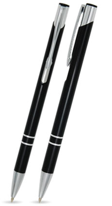 Kovová kuličková propiska v několika barvách s chromovými doplňky (špička, tlačítko, spona a dva designové proužky na těle propisky). Náplň pera je modrá.
