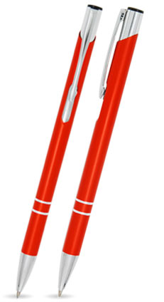 Kovová kuličková propiska v několika barvách s chromovými doplňky (špička, tlačítko, spona a dva designové proužky na těle propisky). Náplň pera je modrá.