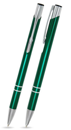 Kovová kuličková propiska v několika barvách s chromovými doplňky (špička, tlačítko, spona a dva designové proužky na těle propisky). Náplň pera je modrá.