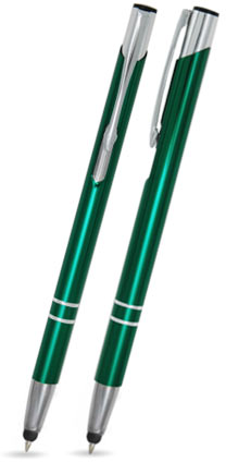 Kovová kuličková propiska v několika barvách s chromovými doplňky (špička, tlačítko a spona) a Touch pen u tuhy. Náplň pera je modrá.