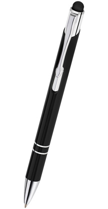 Kovová kuličková propiska s touch penem pro ovládání dotykových displejů v několika barvách s chromovými doplňky (špička, tlačítko, spona a dva designové proužky na těle propisky) a touch pen v barvě propisky. Náplň pera je modrá.