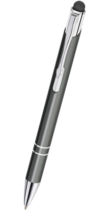 Kovová kuličková propiska s touch penem pro ovládání dotykových displejů v několika barvách s chromovými doplňky (špička, tlačítko, spona a dva designové proužky na těle propisky) a touch pen v barvě propisky. Náplň pera je modrá.