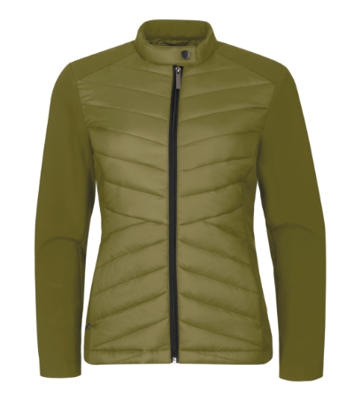 kombinace prošívaného a softshellového materiálu, střih tvarovaný bočními díly, stojáček na druk, celopropínací spirálový zip, boční kapsy se spirálovým zipem, vnitřní náprsní kapsa na zip, vstup pro branding v podšívce zadního dílu