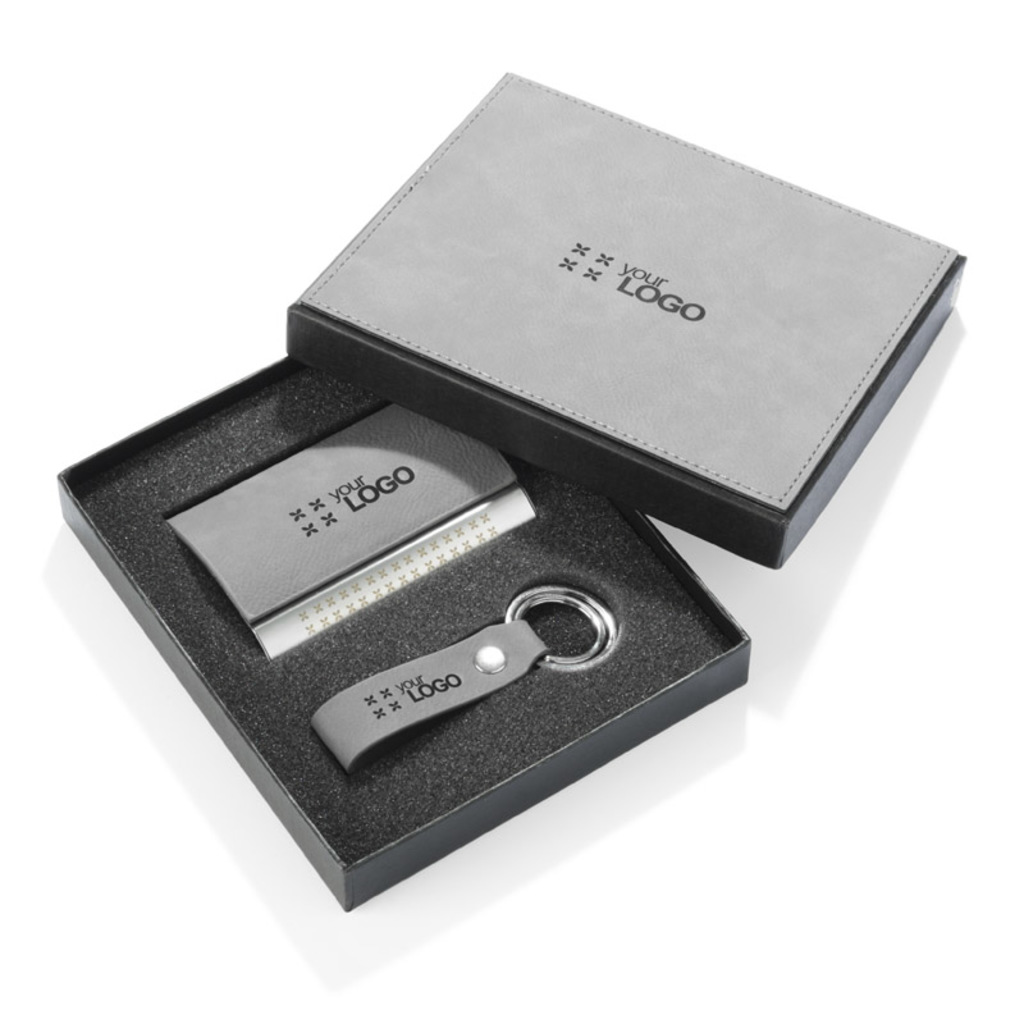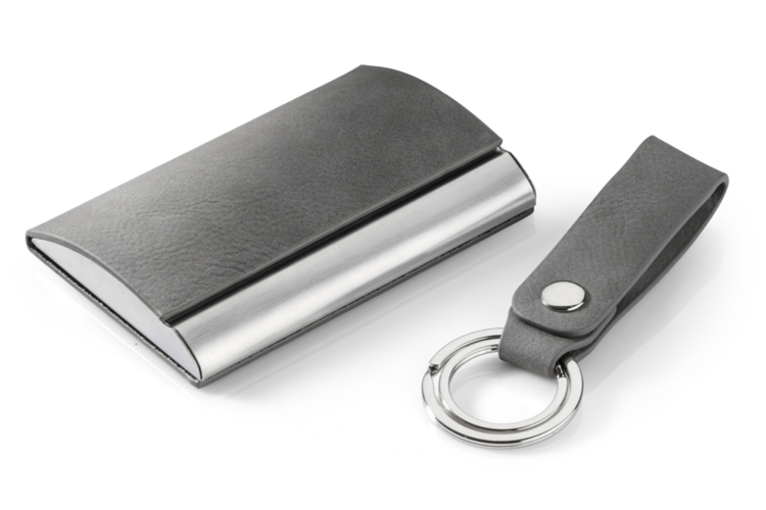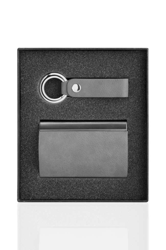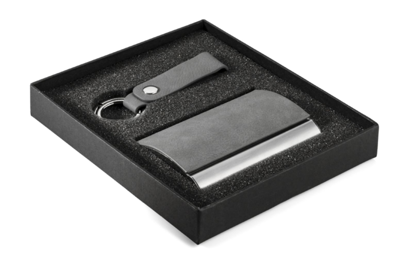 elegantní dárková sada, která obsahuje držák na vizitky a klíčenku. Baleno v elegantní černé krabici. Víko krabice je dokončeno eko-koženkou ve stejné barvě jako klíčenka a držák na vizitky.