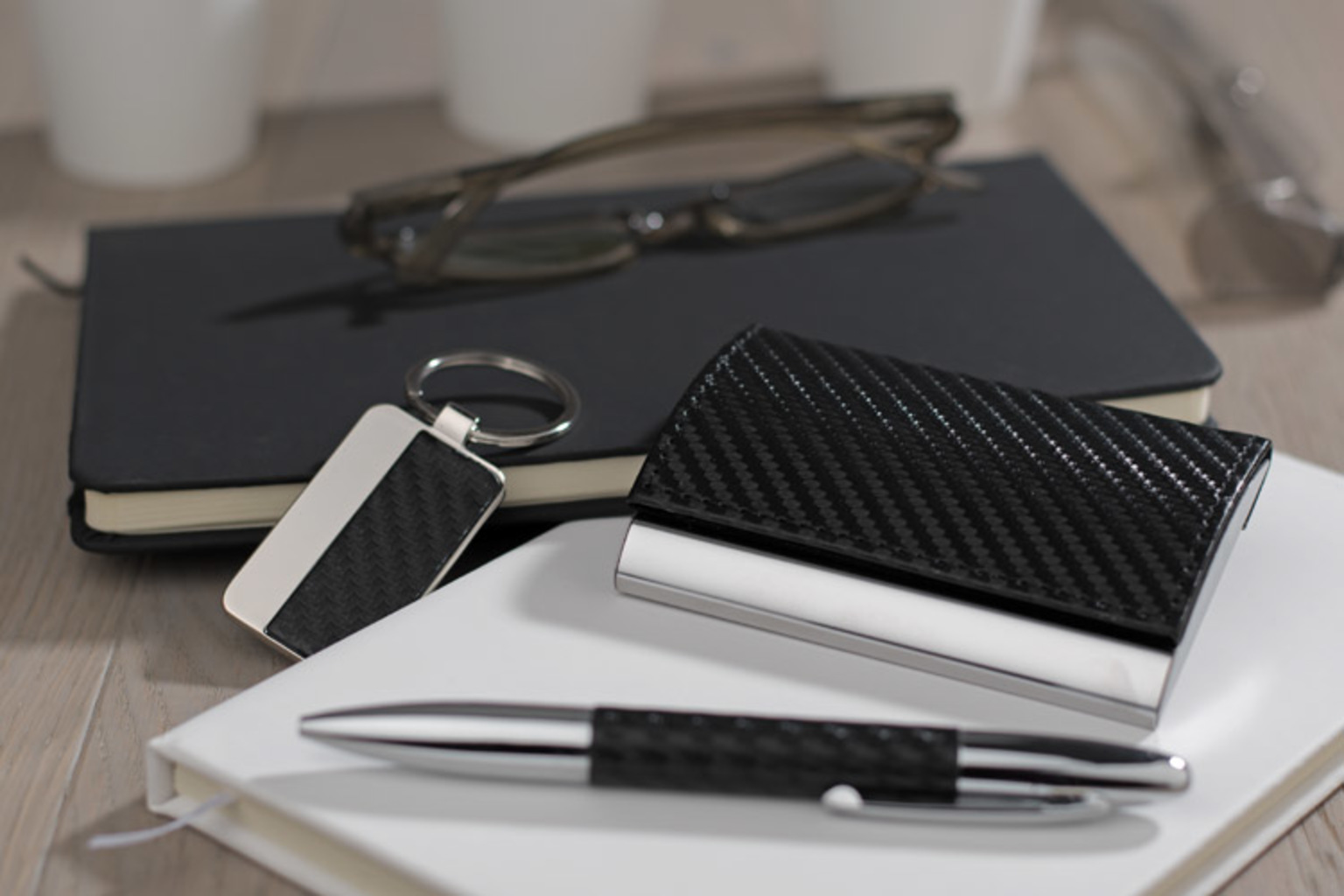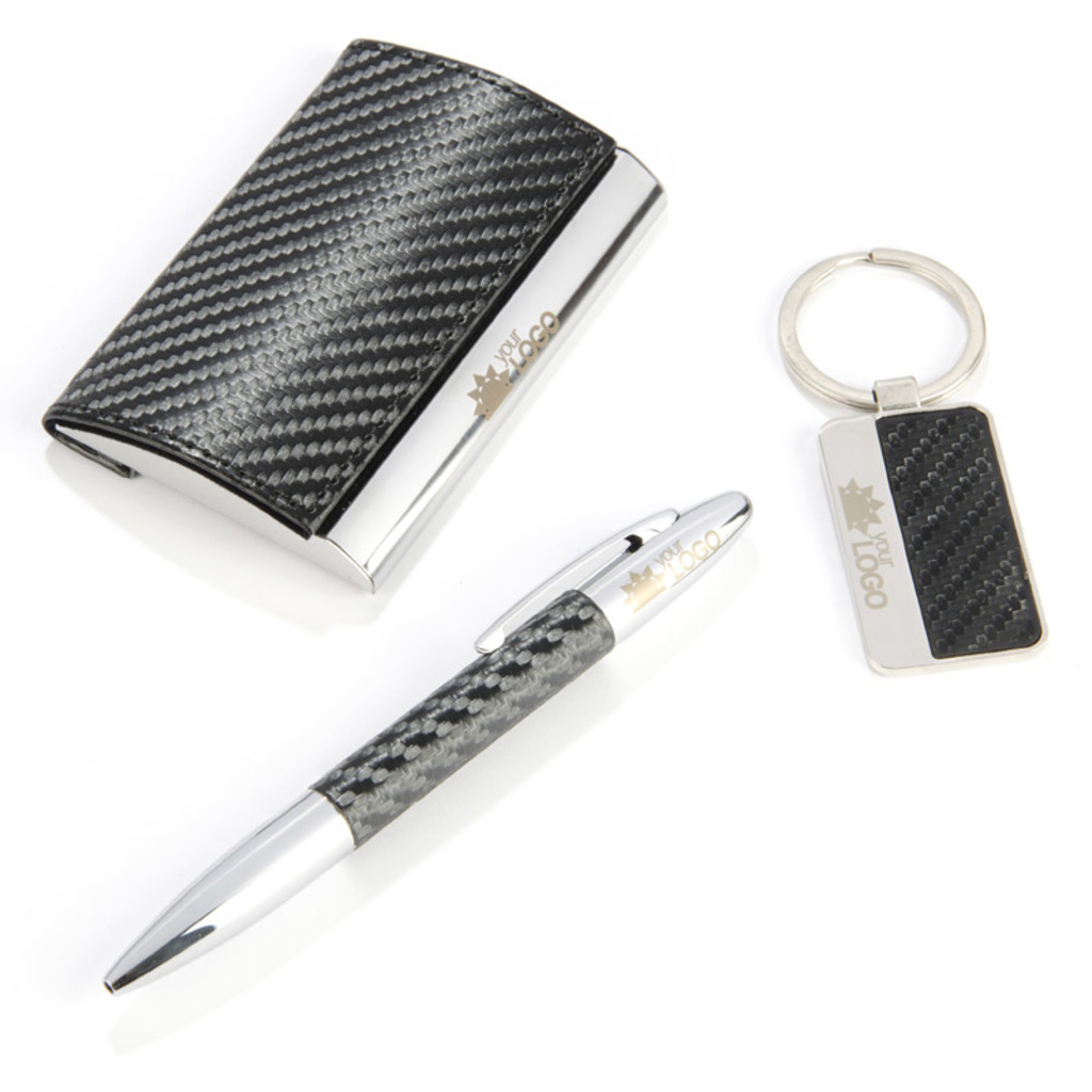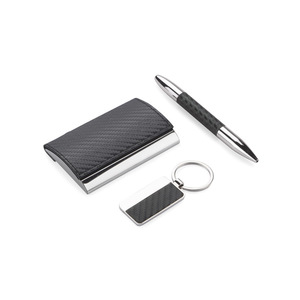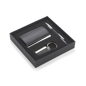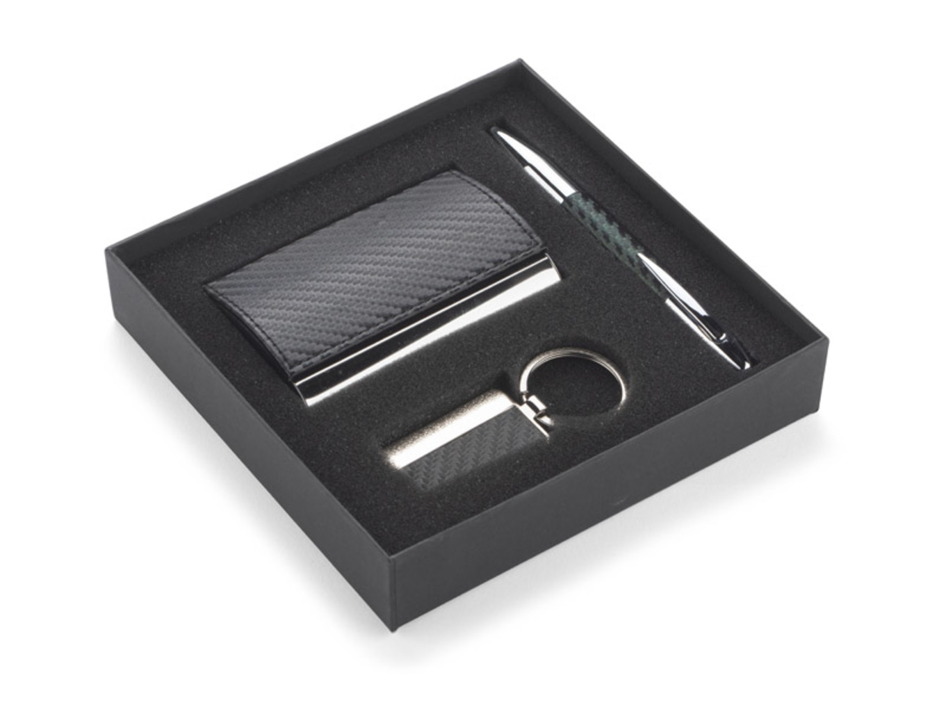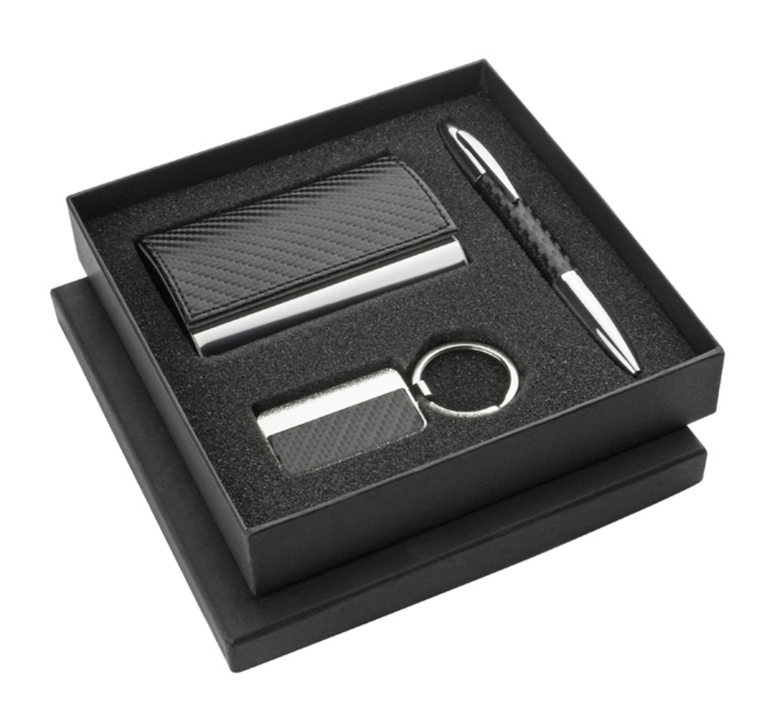 Soubor elegantního daru, který zahrnuje držák na vizitky, klíčenku a pero. Vše zabaleno v černé krabici. Logo může být vyryto na klíčence nebo držáku na vizitky.