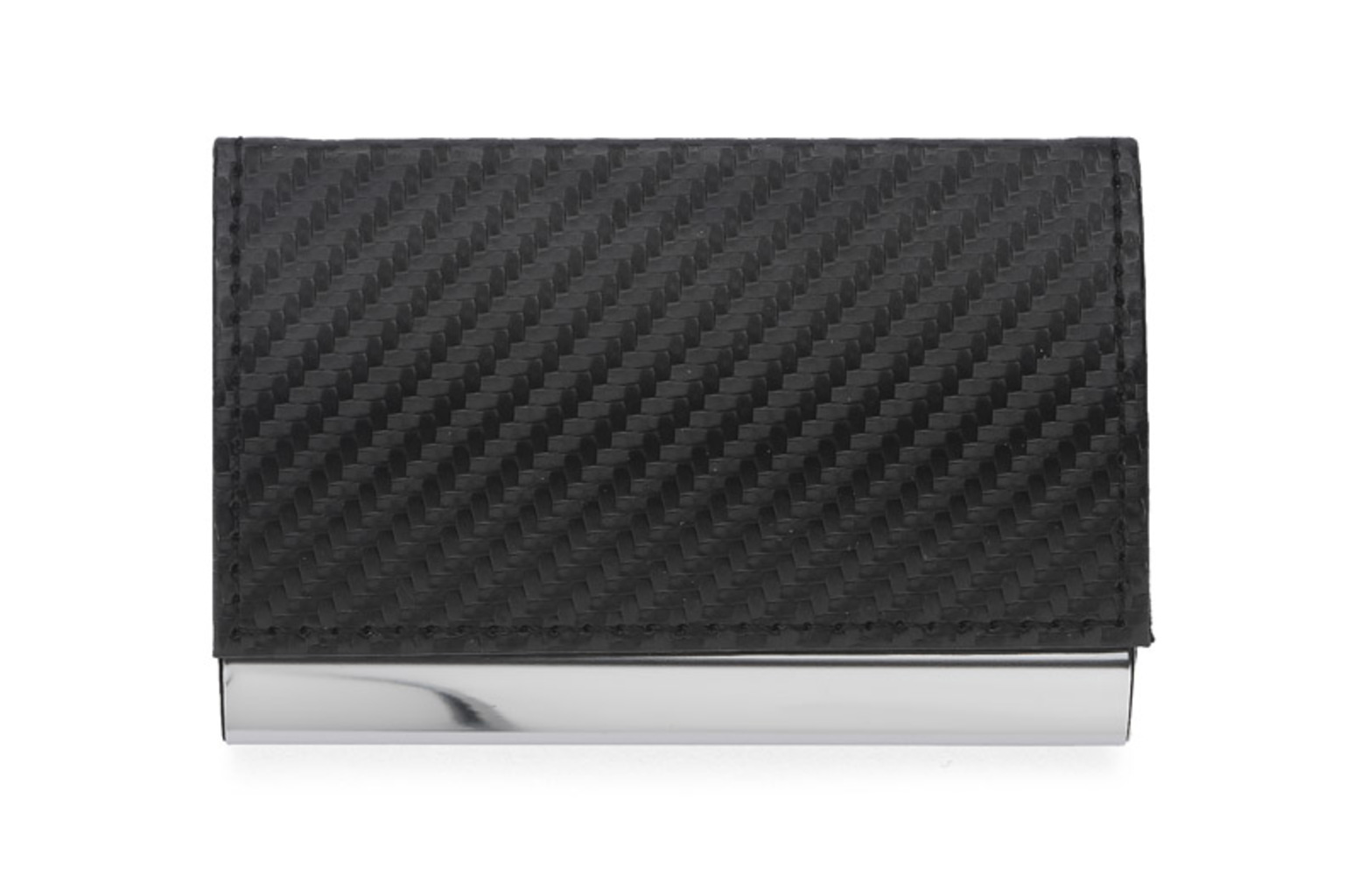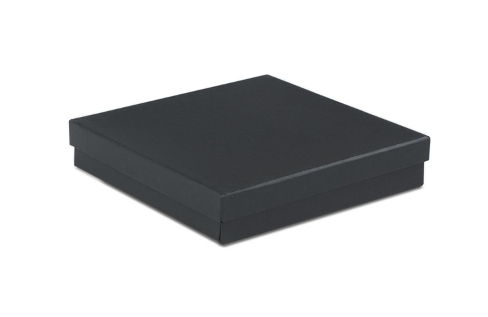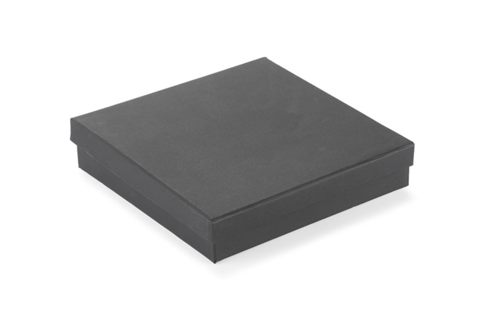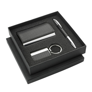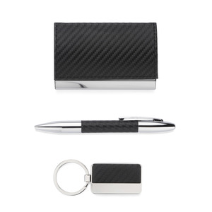 Soubor elegantního daru, který zahrnuje držák na vizitky, klíčenku a pero. Vše zabaleno v černé krabici. Logo může být vyryto na klíčence nebo držáku na vizitky.