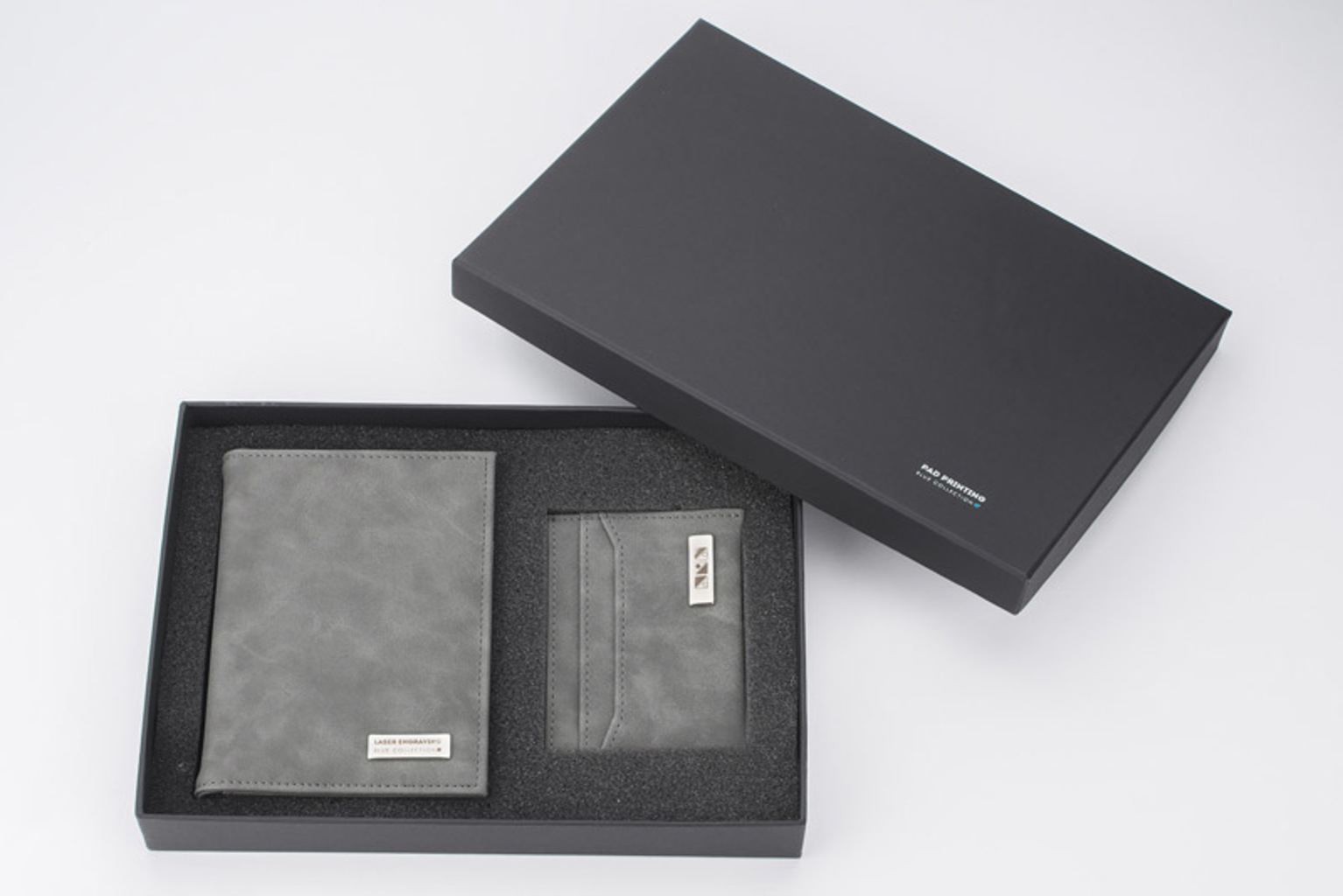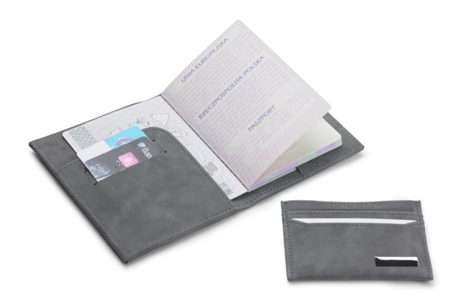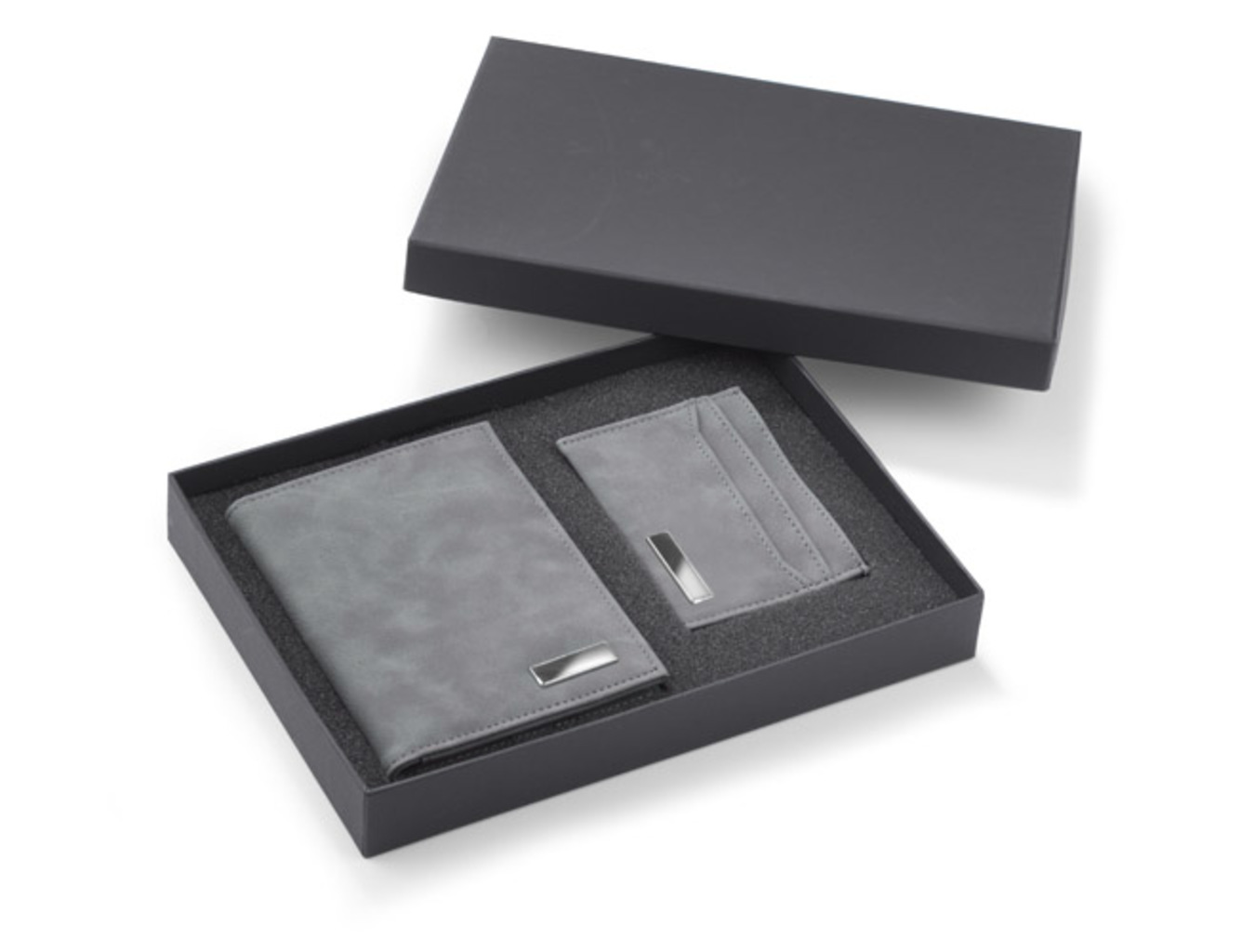 Dárková souprava SALLY složená z pouzdra na pas a pouzdra na kreditní karty. Produkty jsou vyrobené z ekokůže. Má pěknou a universální šedou barvu. Je zabalená do elegantní černé krabičky.