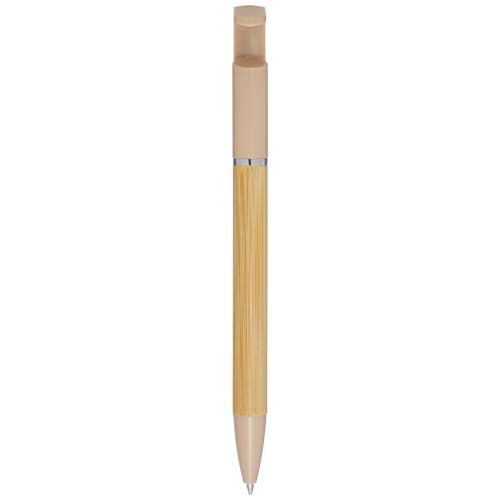 Bambusové kuličkové pero, které funguje také jako držák na telefon. Tlačítko a středový kroužek jsou vyrobeny z recyklovaného plastu, hrot z mosazi a tělo z bambusu z odpovědných zdrojů. Barva inkoustu: Modrá. Délka psaní: 1000 metrů. Rozměr hrotu: 1,0 mm.