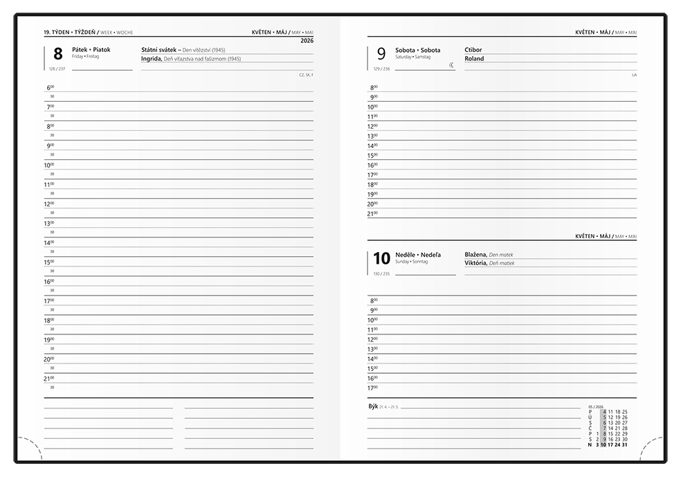 | Barva a materiál: | jemný hladký materiál vivella, celoplošná ražba motivu včetně ražby roku, gumička, poutko na propisku, šitá vazba V8, kapitálky, stužka, perforované rožky, vlepená kapsa, ofset, 70g/m2 | ||||||||||||||
